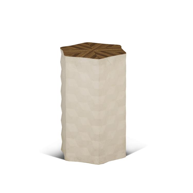 Cast Cremona concrete hexagonal accent table with Zebrano top.
