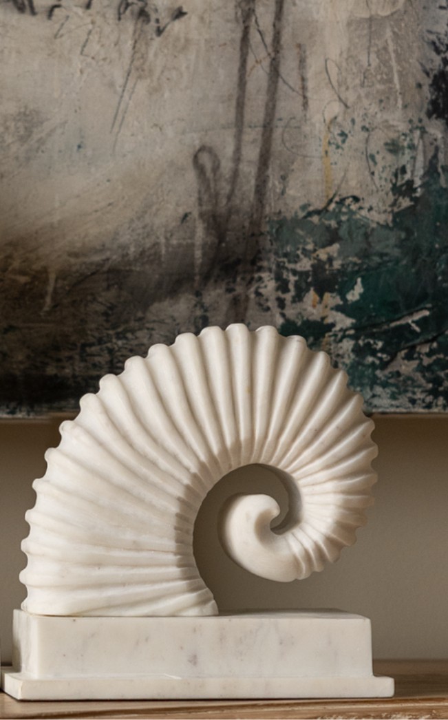 A more intimate expression of the same fossil-inspired spiral, the Small Ocean Memories is carved from softly toned Dhrangadhra marble with finely fluted ridges that echo the geometry of a nautilus shell. Resting on a solid marble plinth, it offers a refined decorative accent that feels both organic and sculptural. Designed as a companion to the larger piece, it pairs beautifully while maintaining its own quiet presence.