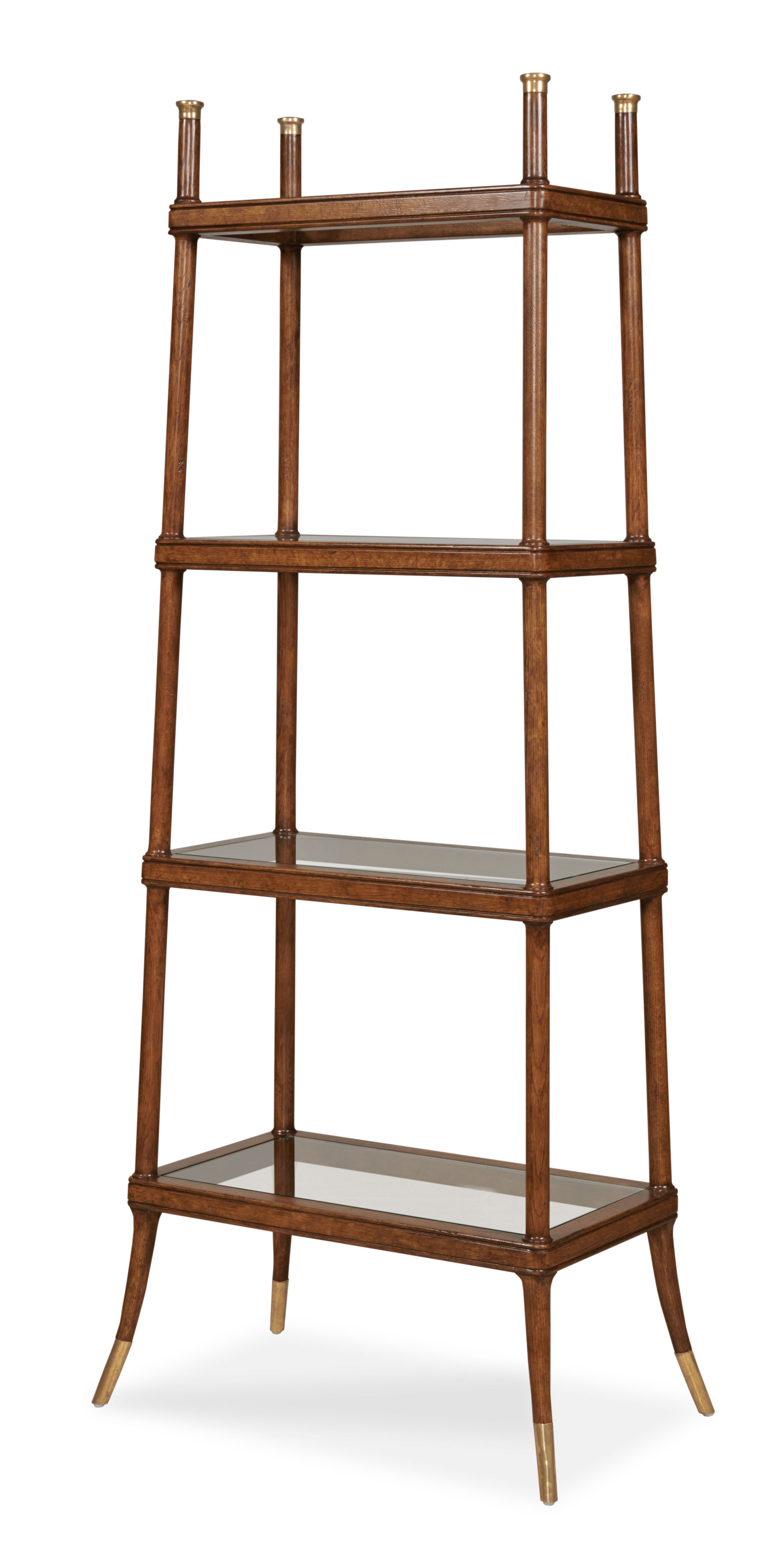 A sculptural étagère that blends lightness and structure. Its tall, tapered oak frame and gently flared legs create an elegant vertical rhythm, while open glass shelves balance display and function. Finished in soft oak, it feels both architectural and organic.