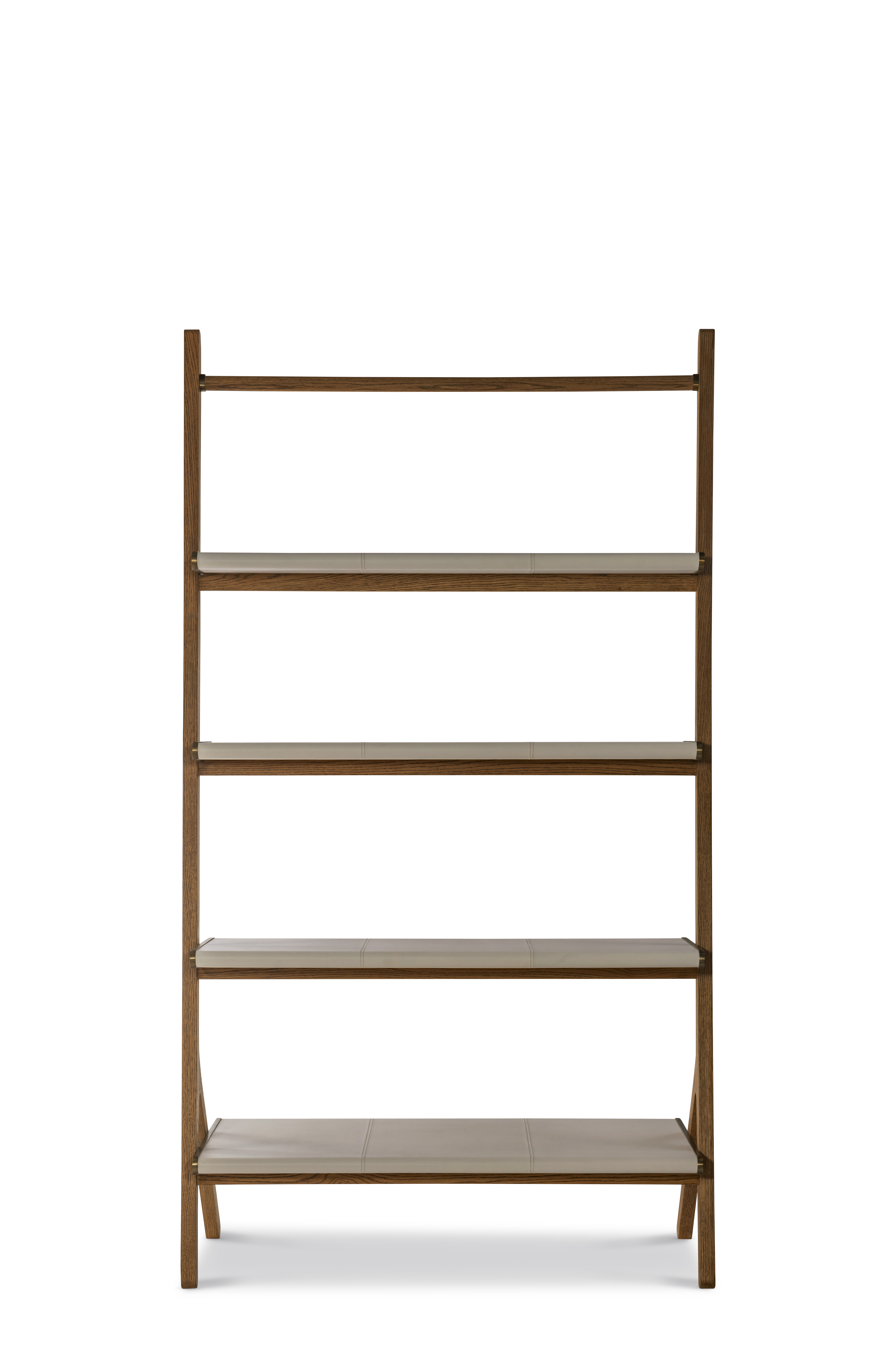 Sleek, sculptural, and functional, this ladder-style étagère reimagines modern display with refined craftsmanship. The light oak-finished frame leans gracefully against the wall, supporting tiered shelves wrapped in cream colored hand-stitched leather.