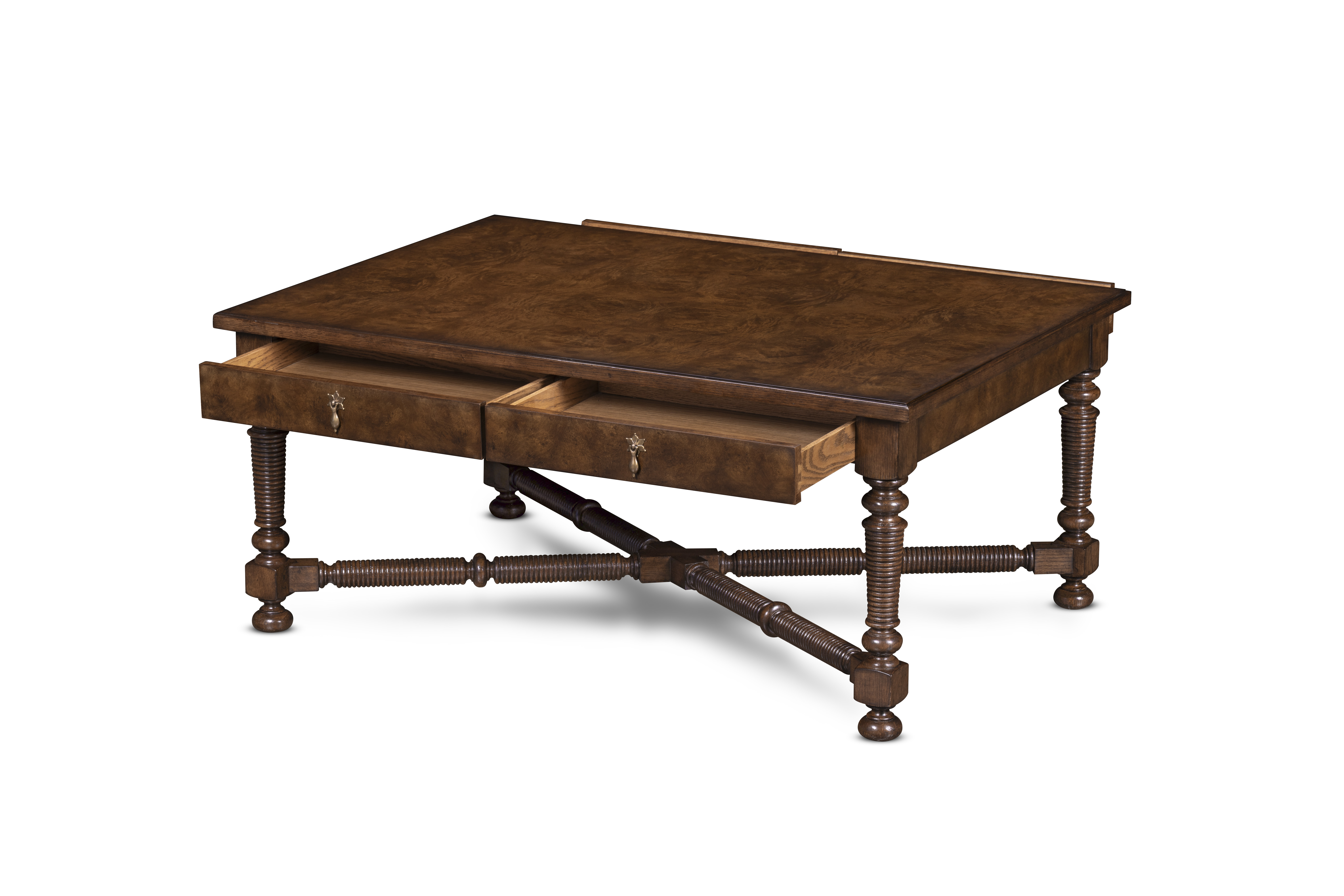 This hand-finished side table reflects devotion to artistry in form and detail. The richly grained oak burl top rests upon turned and ribbed legs joined by a sculptural stretcher—each element shaped and assembled by hand to evoke quiet grandeur. Four drawers with cast-brass pull adds both elegance and utility—an heirloom accent that marries craftsmanship and character.