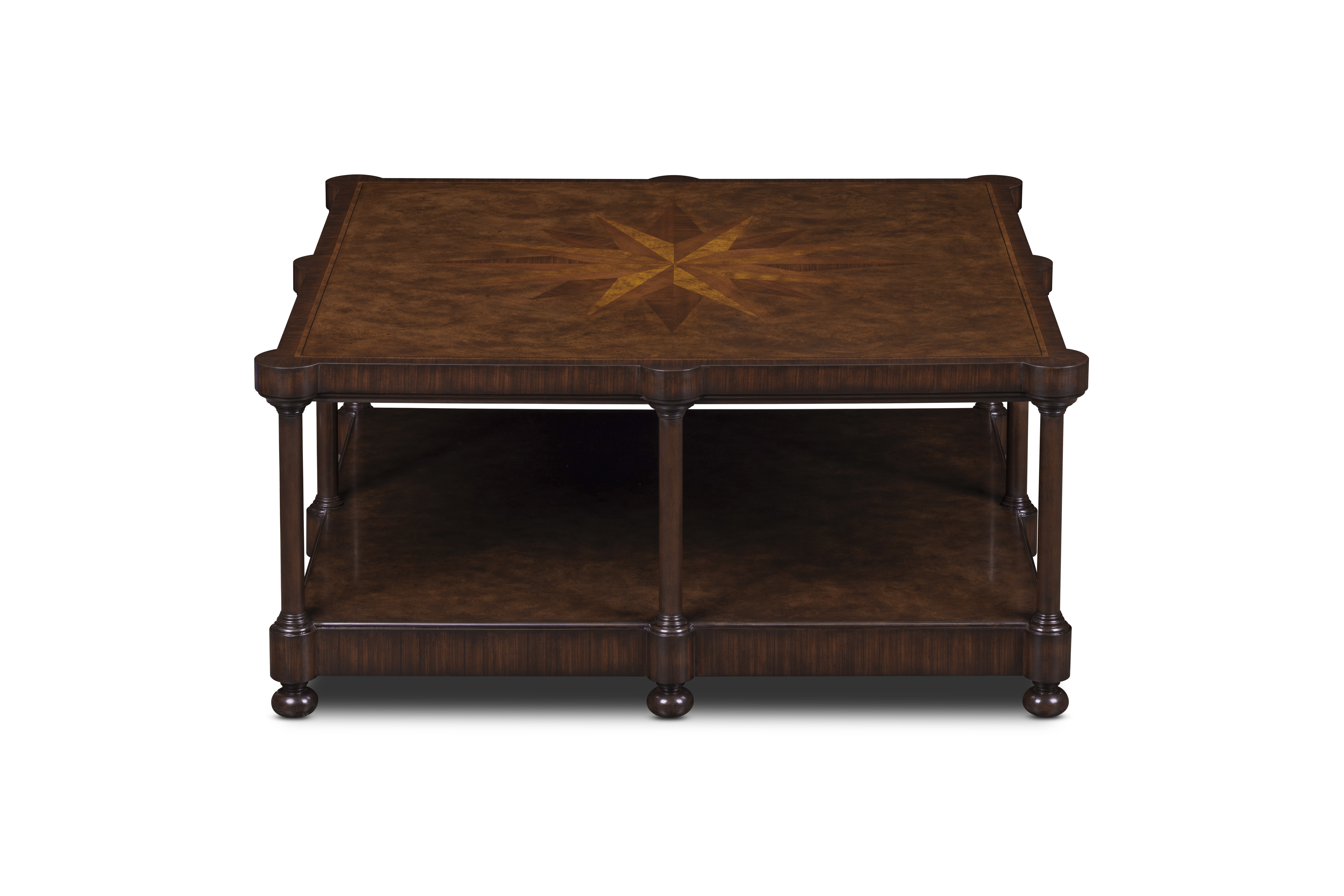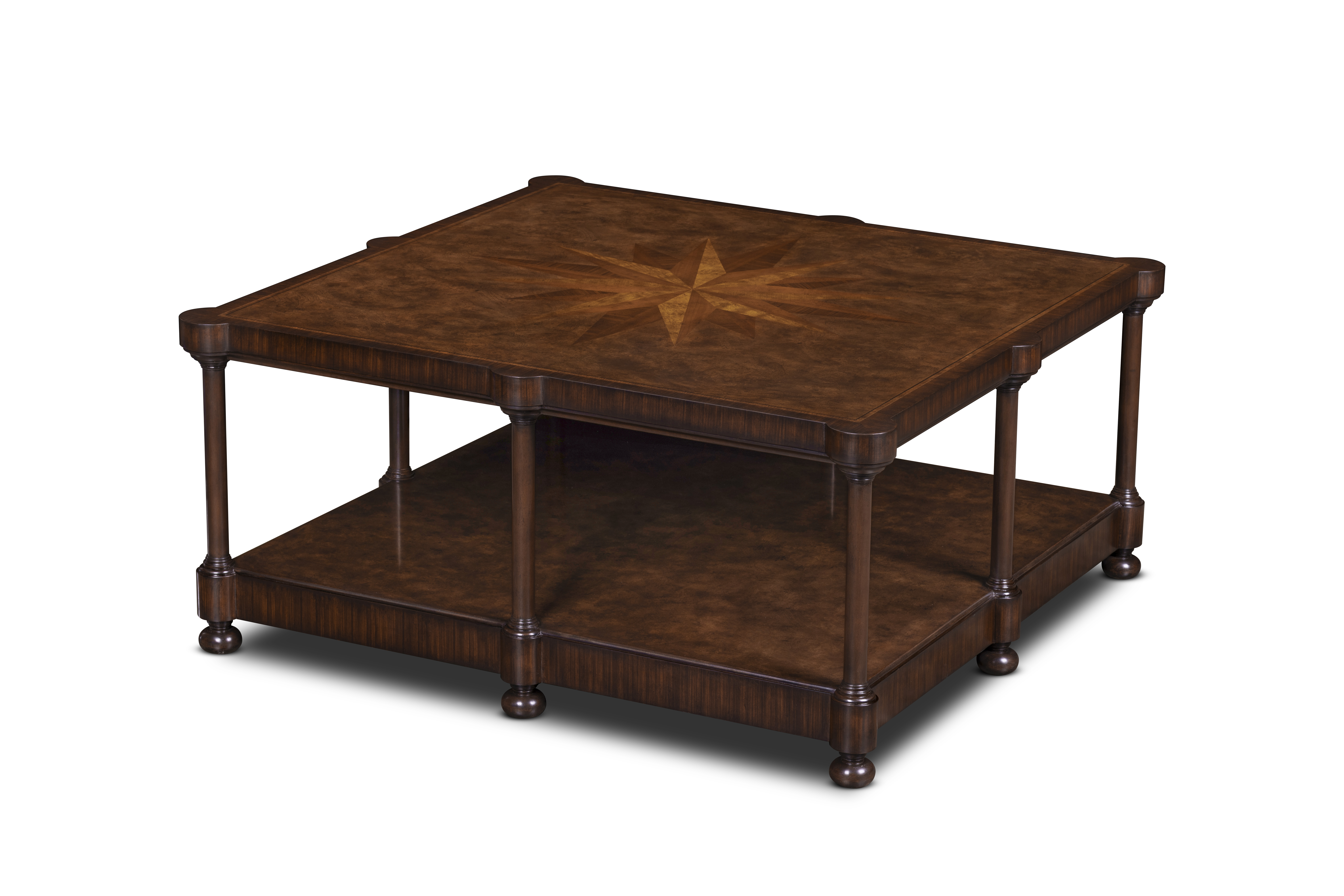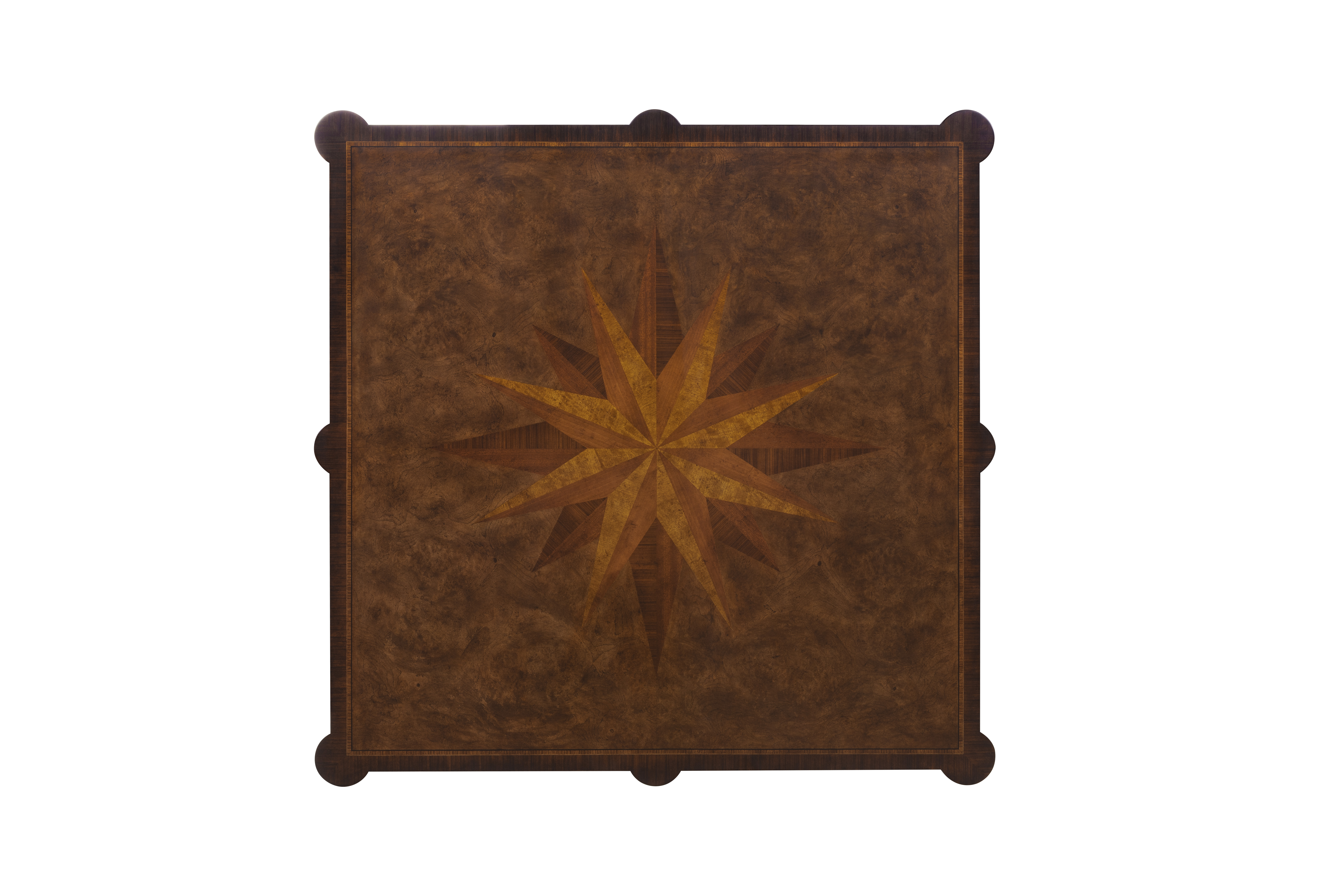 A study in proportion and craftsmanship, this square cocktail table showcases the artistry of hand-matched veneers and traditional joinery. The tabletop’s inlaid starburst motif radiates from the center, drawing the eye to its finely balanced geometry. Supported by turned legs and finished with a lower shelf for display or storage.
