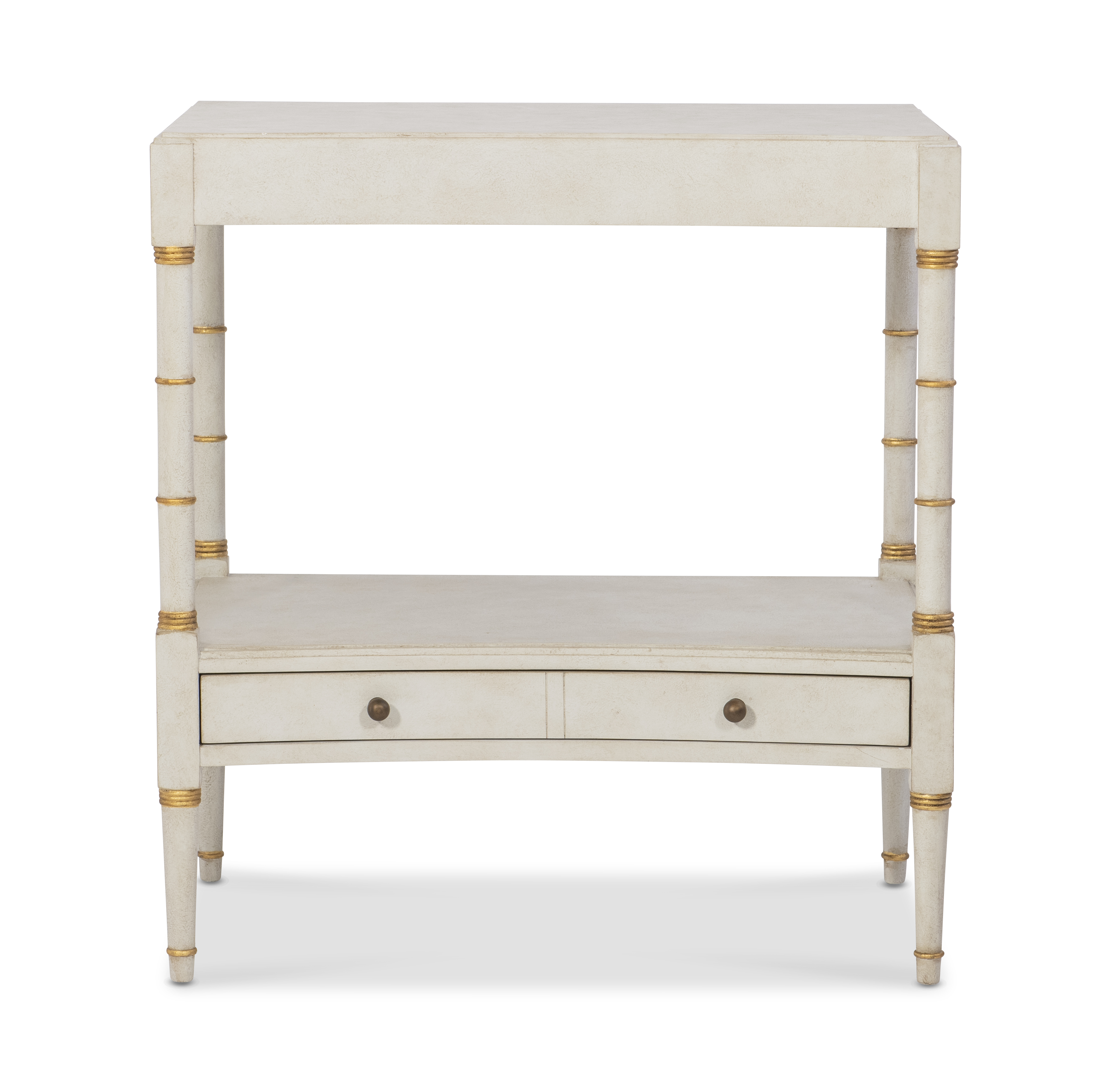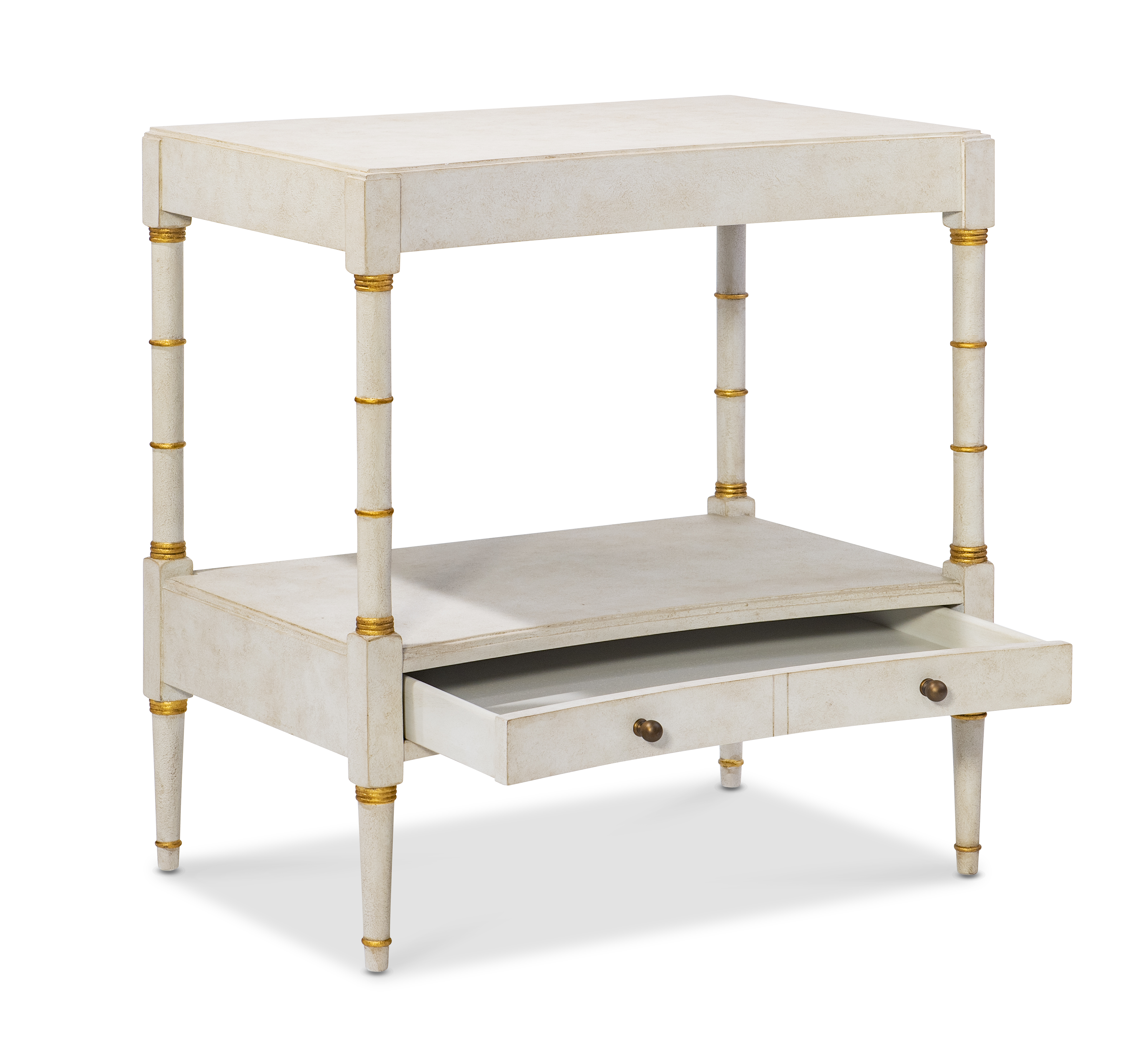 A graceful accent piece that blends neoclassical inspiration with modern refinement. This two-tier table features a soft French ivory finish, elegantly tapered legs, and subtle gold ring detailing. Its curved lower drawer front adds a touch of sophistication, echoing our legacy of handcrafted luxury with a contemporary sensibility.