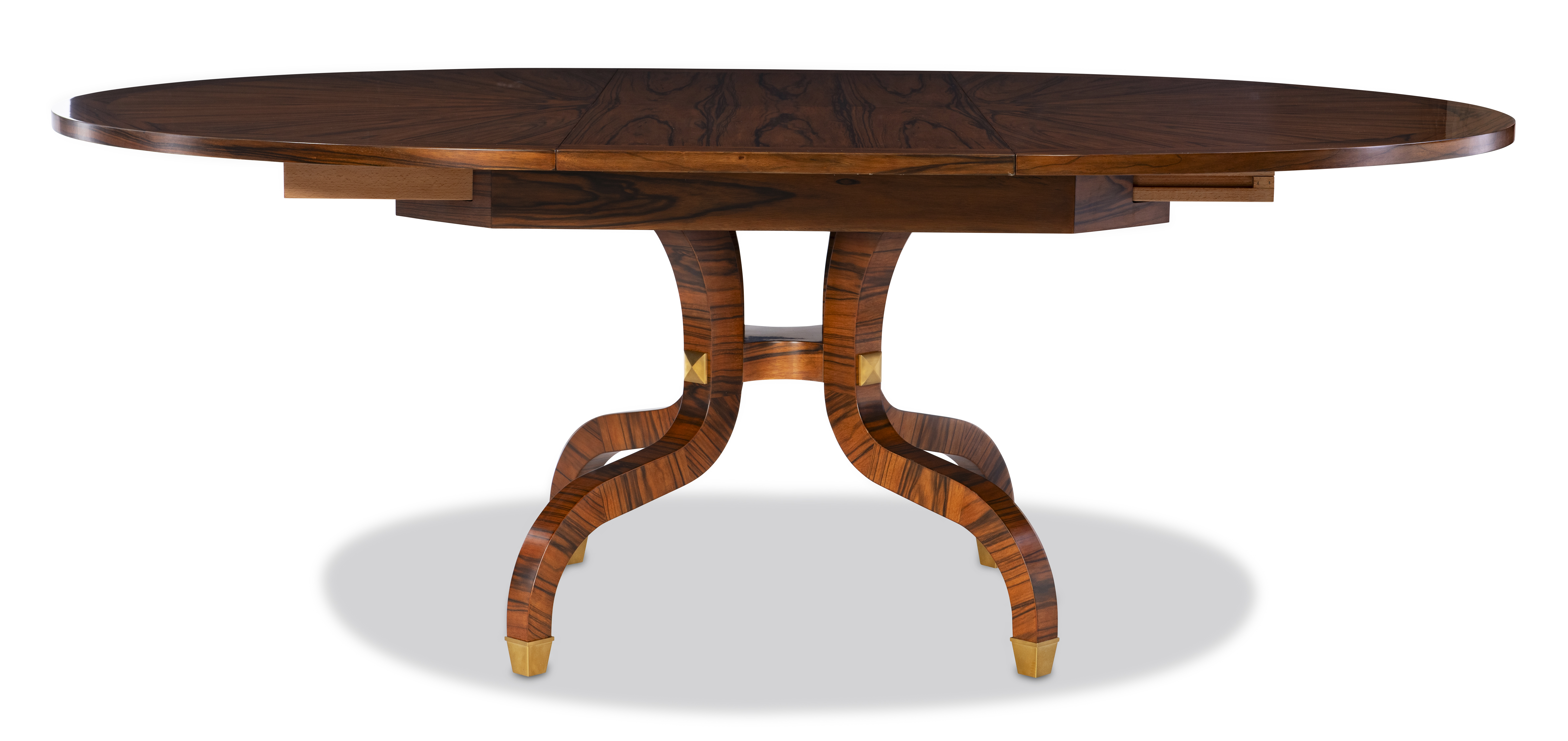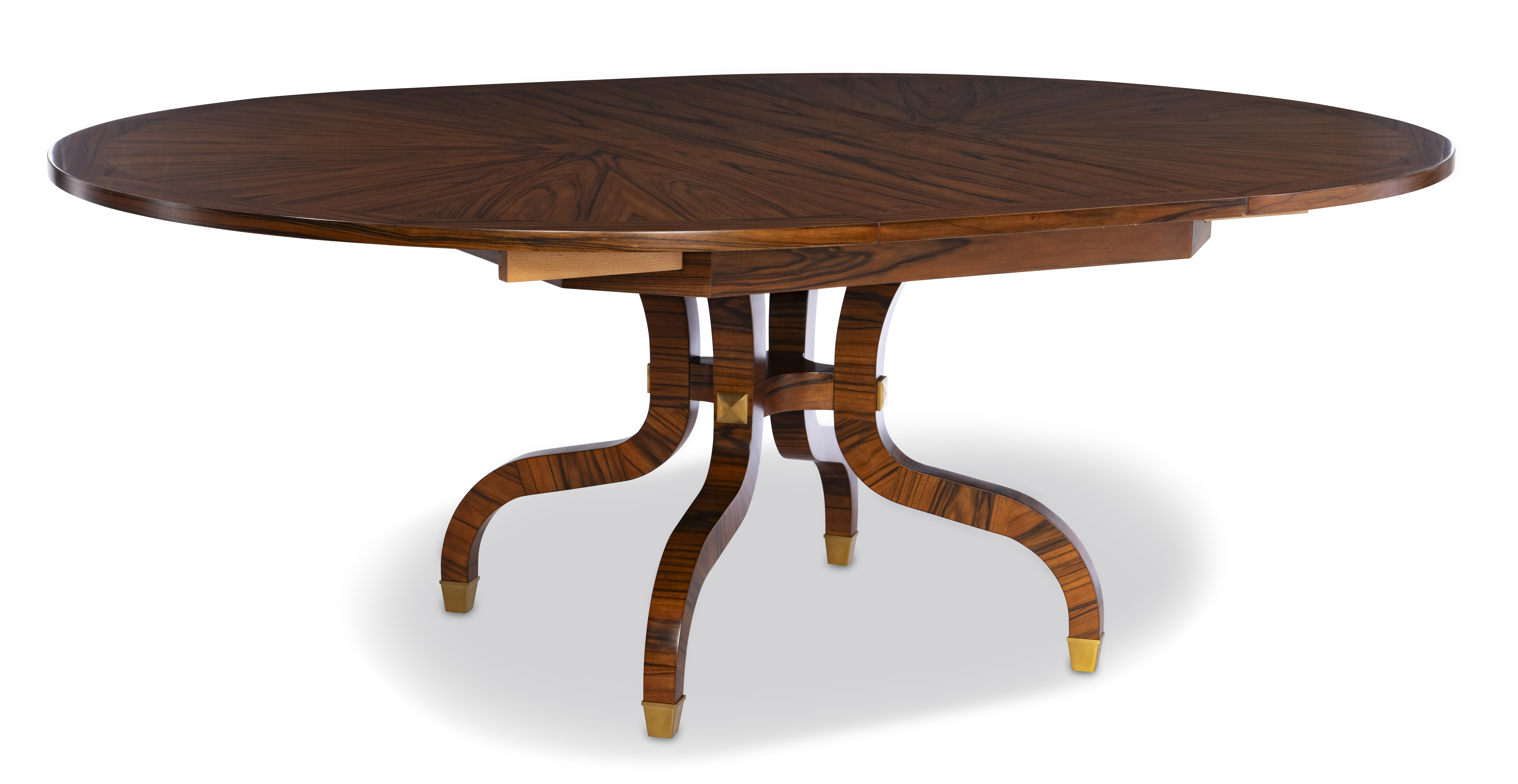 An exquisite dining table that celebrates artistry in wood craftsmanship. The Paldao wood top showcases a dramatic sunburst veneer pattern radiating from the center, perfectly balanced by a pair of sculptural cabriole-style pedestal bases. This piece embodies our devotion to intricate detail and timeless form, offering a modern take on classic elegance. Table includes one 22" center leaf, bringing the maximum possible width to 72 inches.