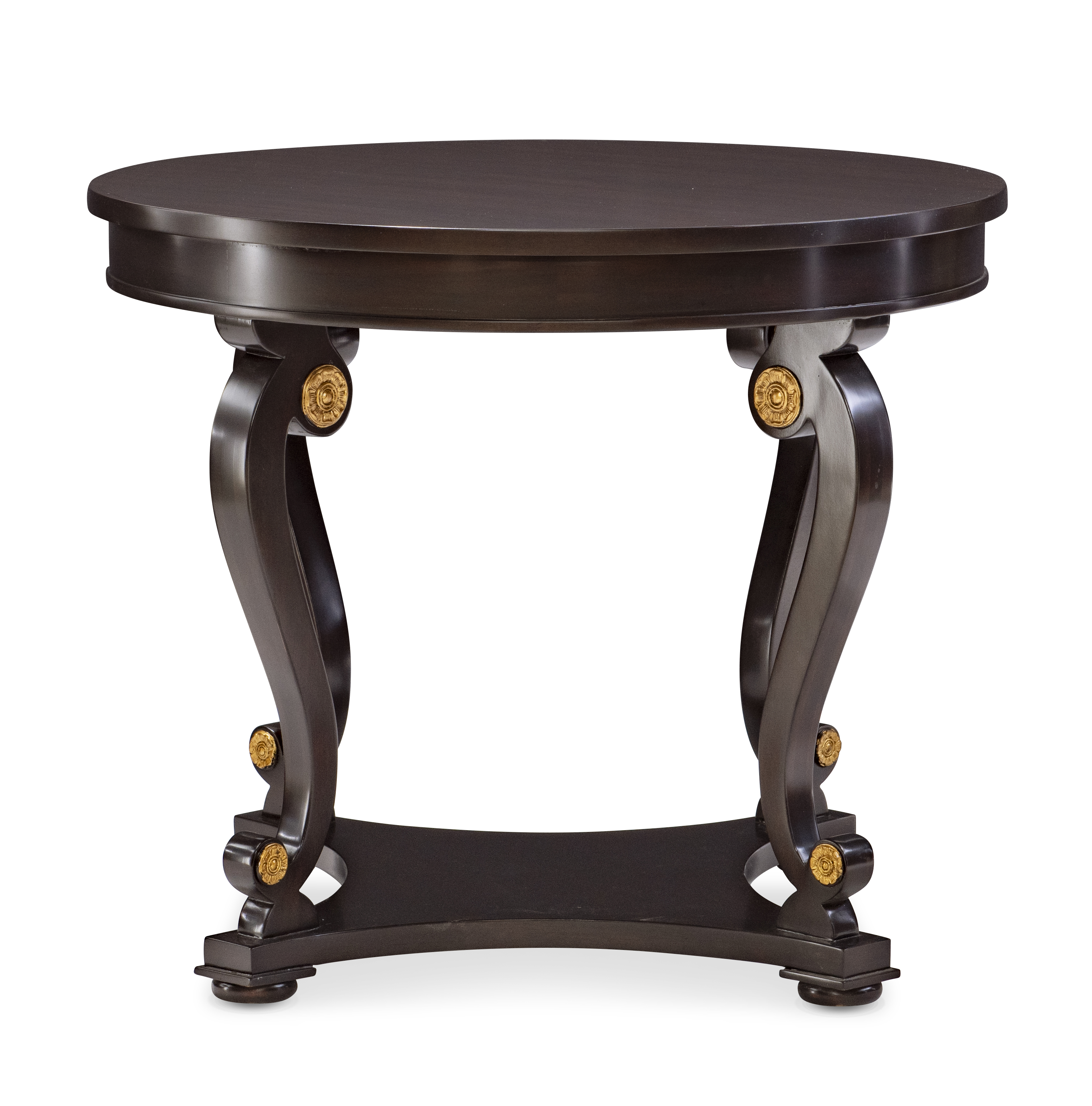 A refined round accent table that balances sculptural form with classical detailing. The curving legs and triangular stretcher base create a graceful silhouette, accented by gilded rosettes that add subtle ornamentation. Its dark, slightly transparent ebonized mahogany finish and clean geometry nod to a legacy of combining timeless craftsmanship with understated luxury.