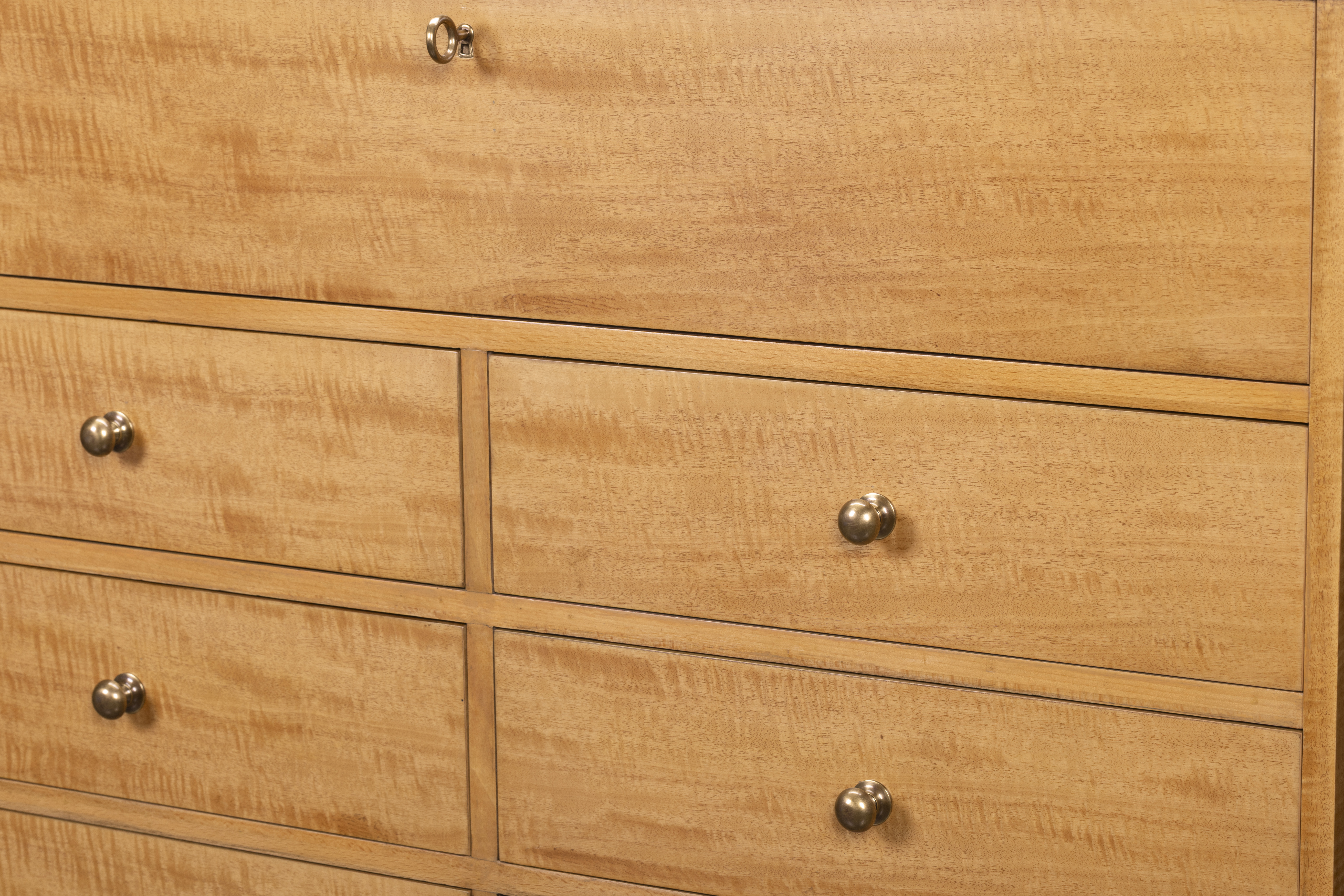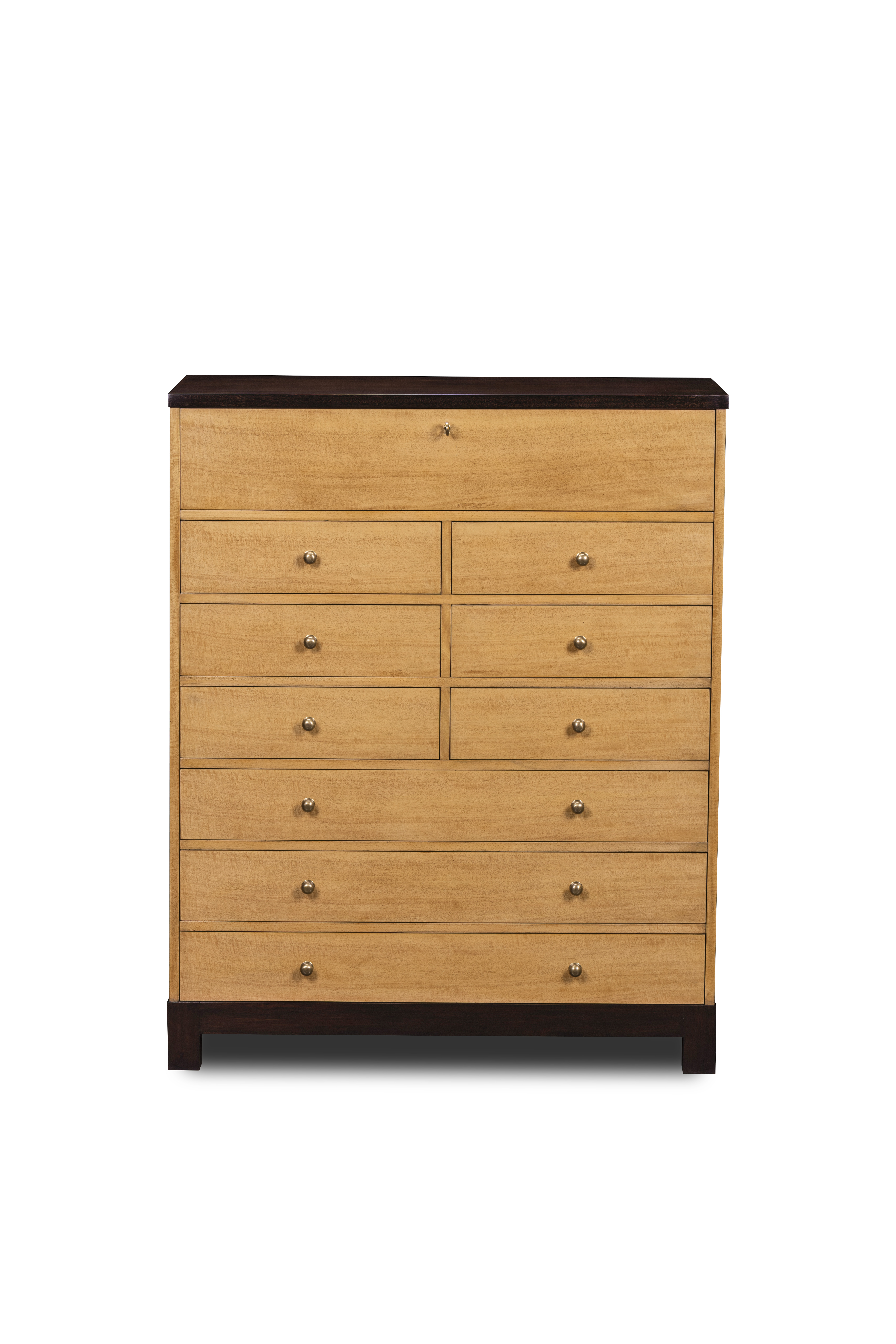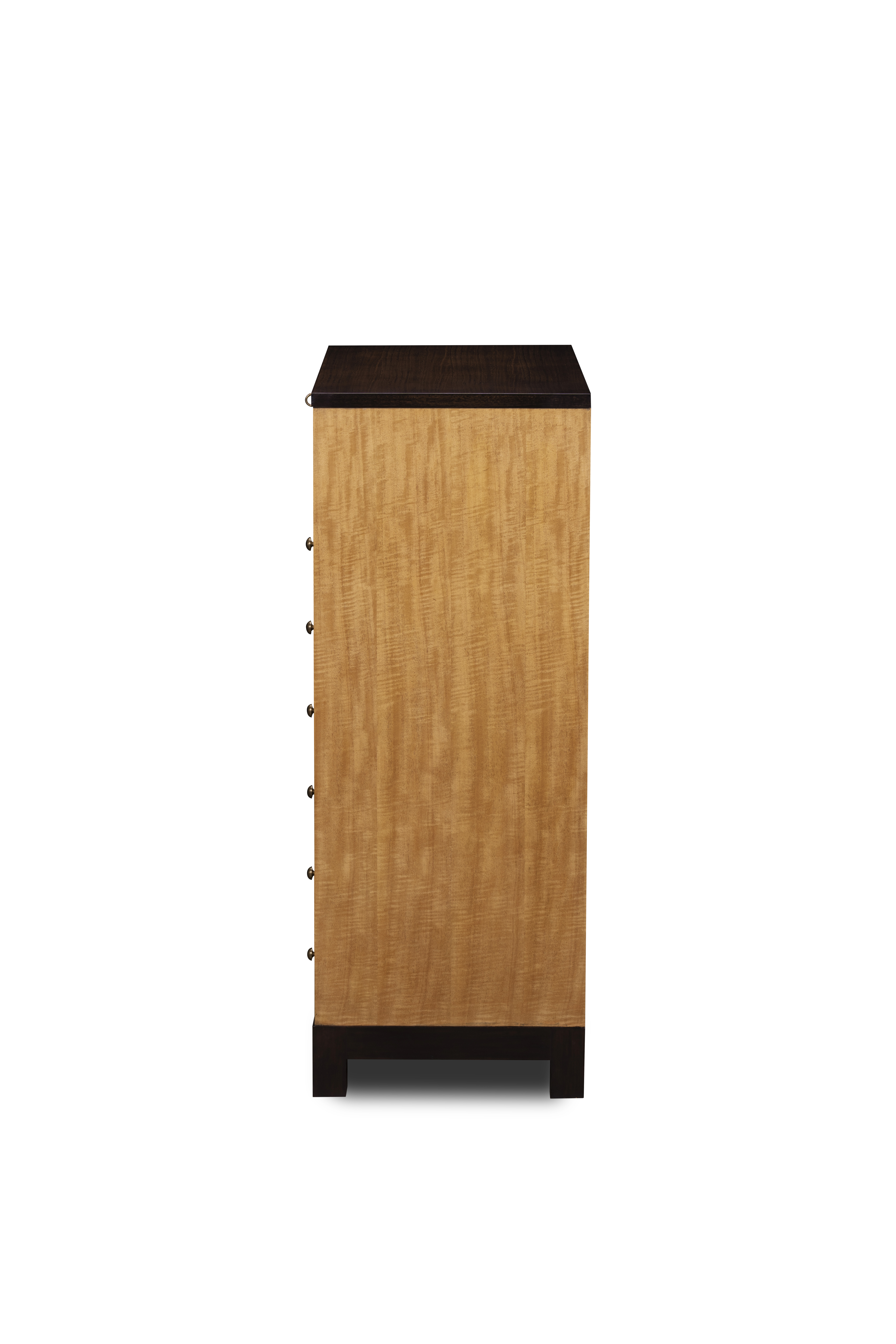 Clean-lined and impeccably crafted, this tall chest of drawers reflects Maitland-Smith’s devotion to materials and proportion. The luminous figured anegre veneer is framed by a contrasting dark smoked eucalyptus base and top, creating a composition of subtle drama and timeless balance. Elegant hardware and meticulously fitted drawers complete the piece—an embodiment of quiet sophistication and functional beauty.