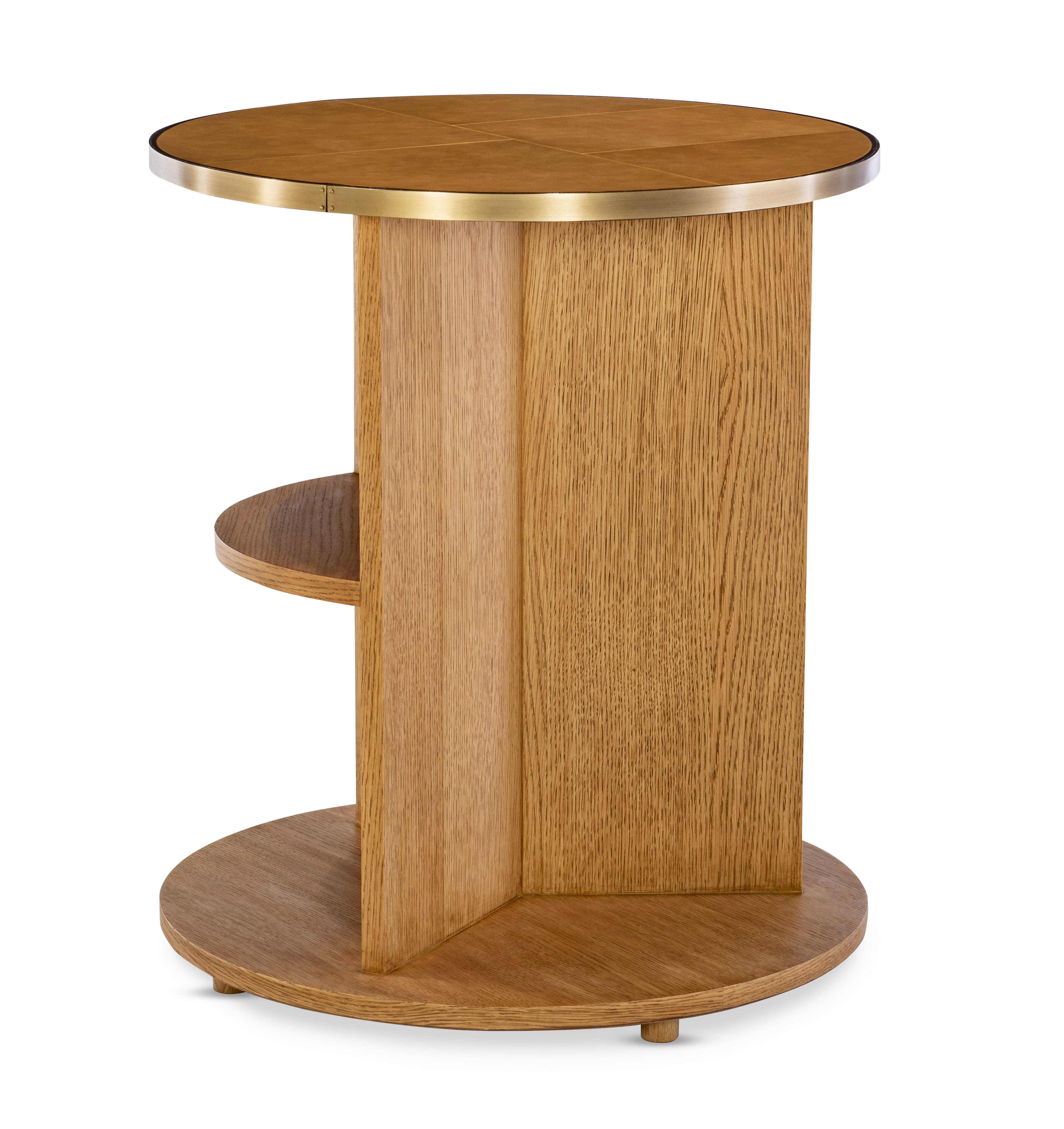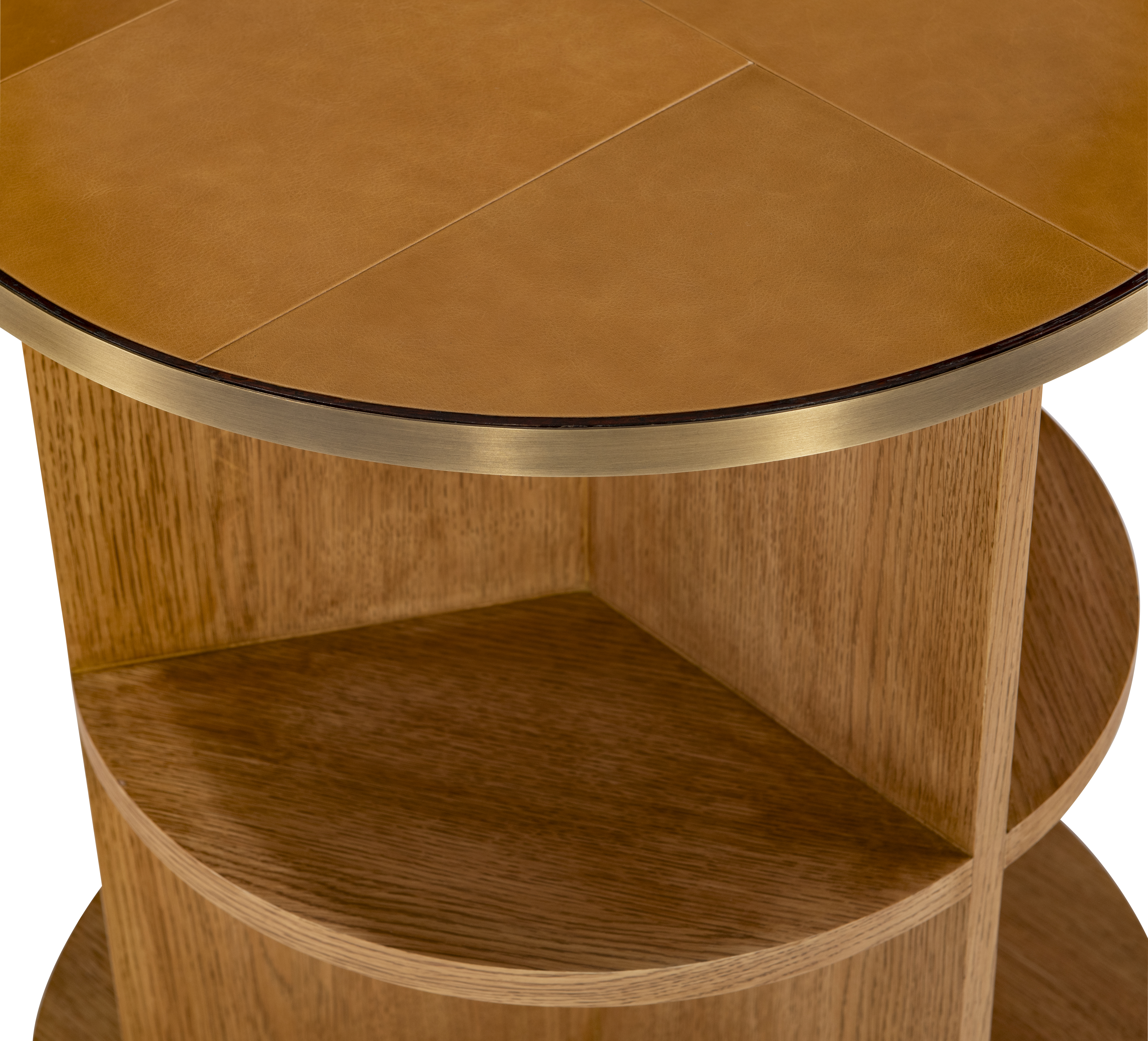 This round side table pairs warm, modern materials with sculptural balance. The caramel leather–wrapped top is framed in brass, resting on an oak base with integrated quarter-shelf storage. Its compact form and fine detailing make it an elegant complement to both classic and contemporary interiors.