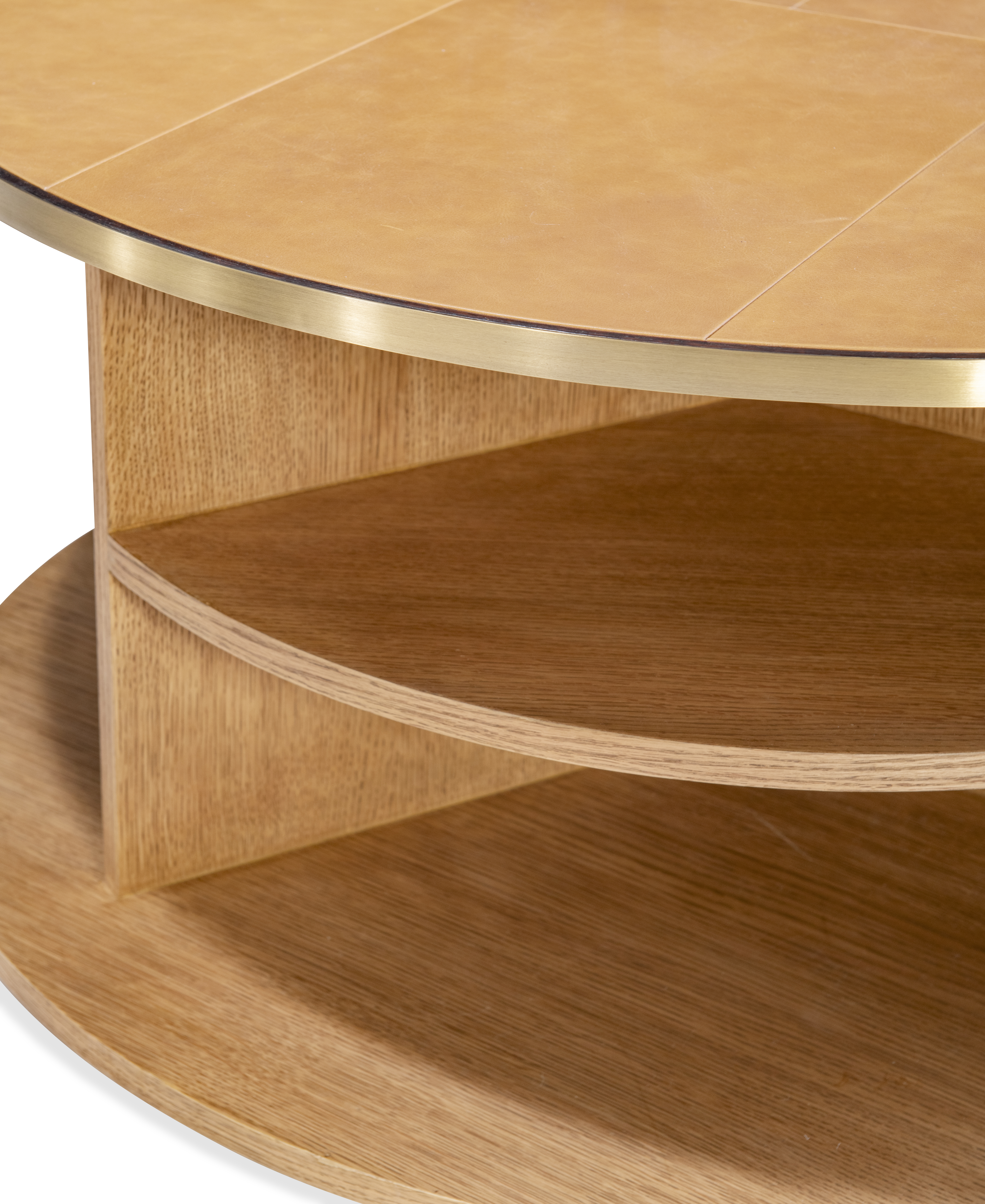 Refined yet contemporary, this round coffee table showcases a warm caramel leather-wrapped top framed in brass and balanced over an oak base. The circular silhouette emphasizes harmony and proportion, while the lower shelf adds functional display space. A statement of modern craftsmanship with classic undertones.