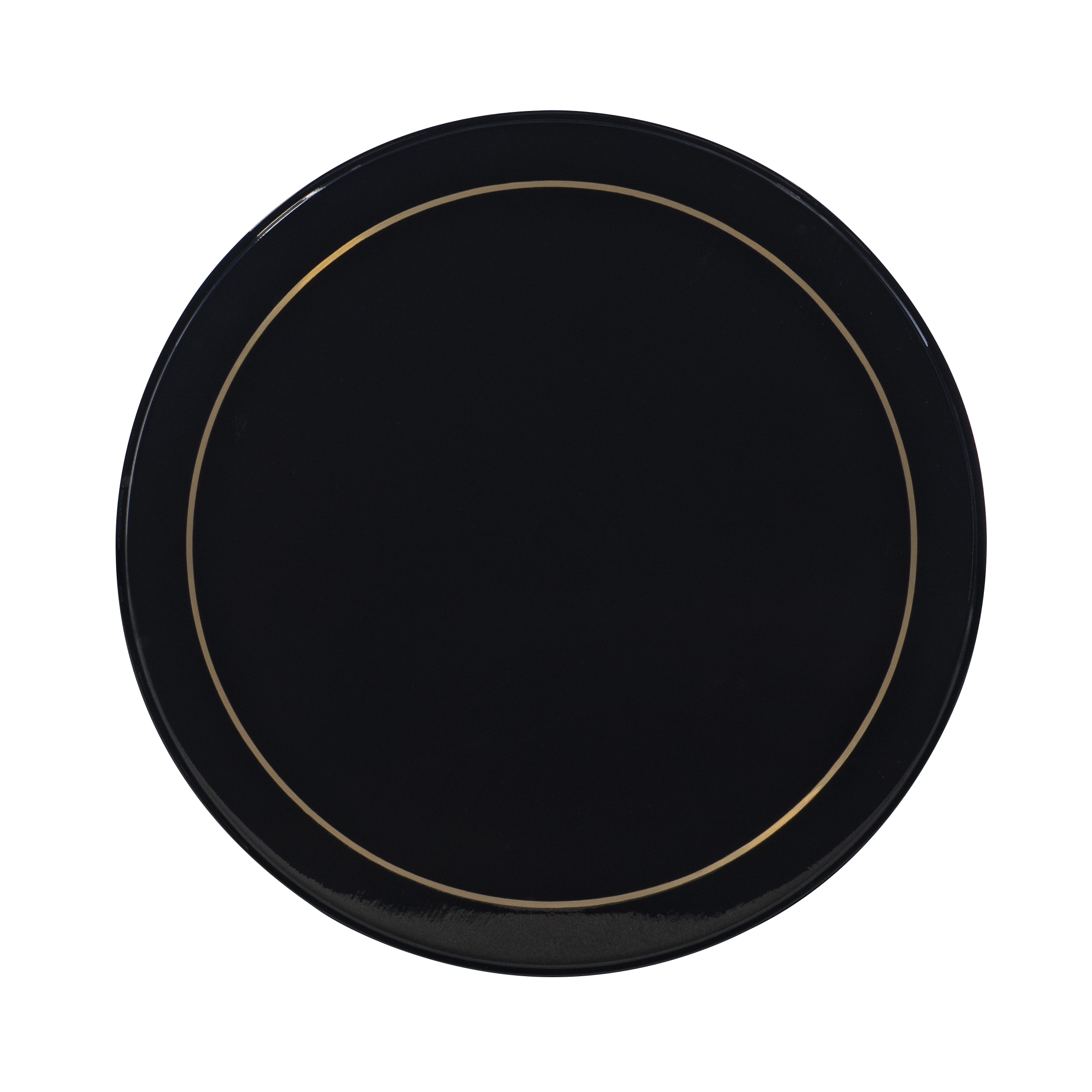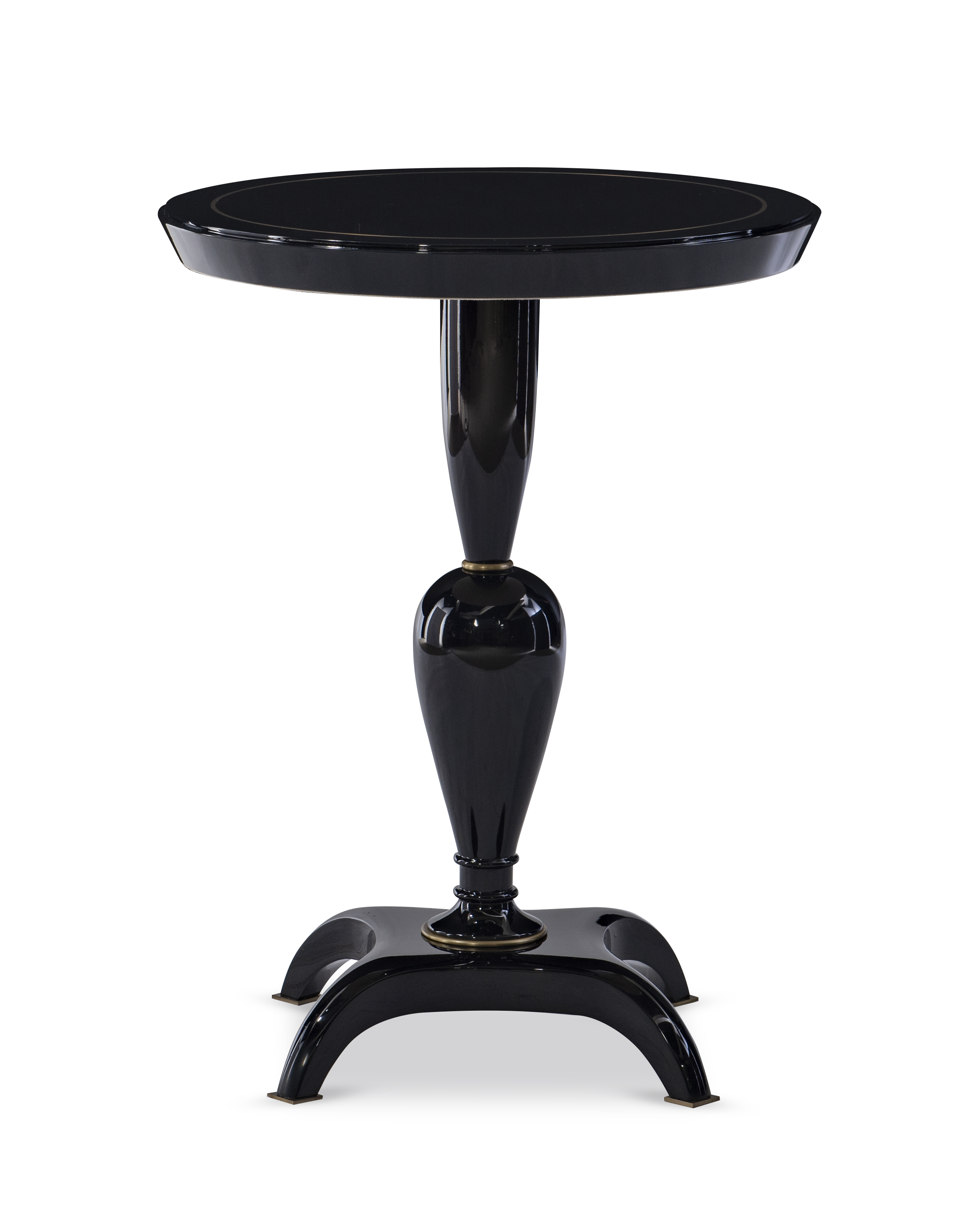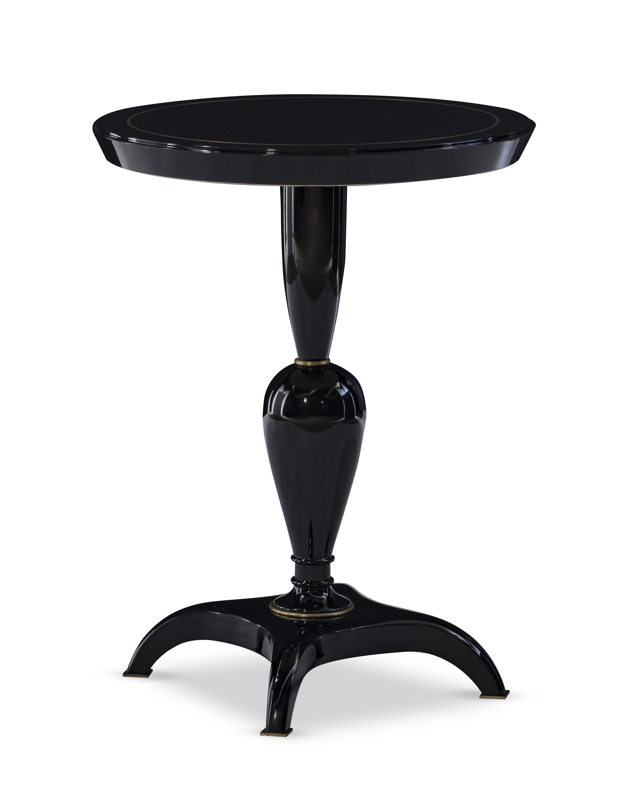 This ebonized pedestal accent table captures the essence of refined classicism with a modern sensibility. The sleek, round top features a subtle brass inlay, while the sculpted pedestal base rests gracefully on arched feet. A perfect blend of craftsmanship and understated luxury, it serves beautifully beside a chair or as a statement piece on its own.