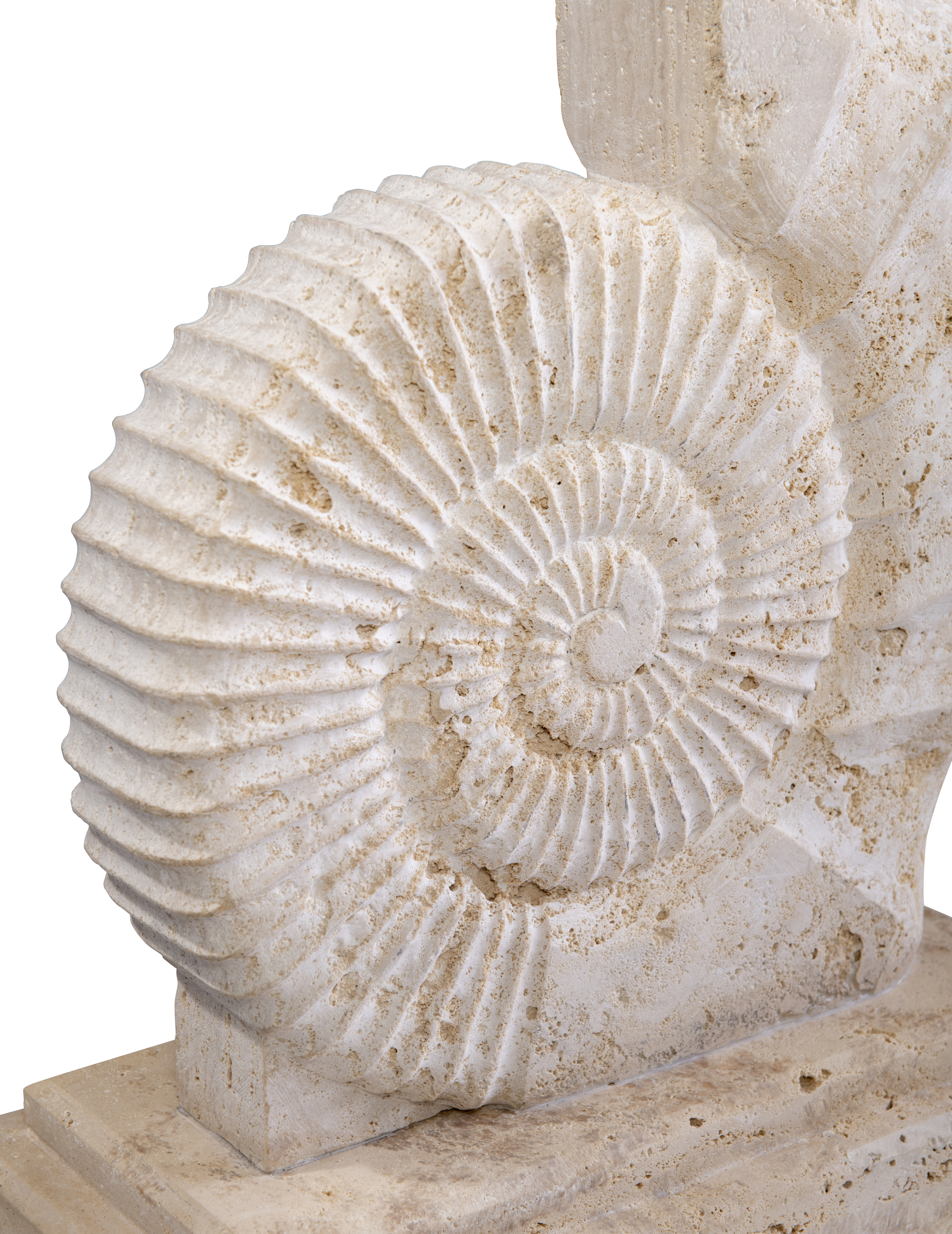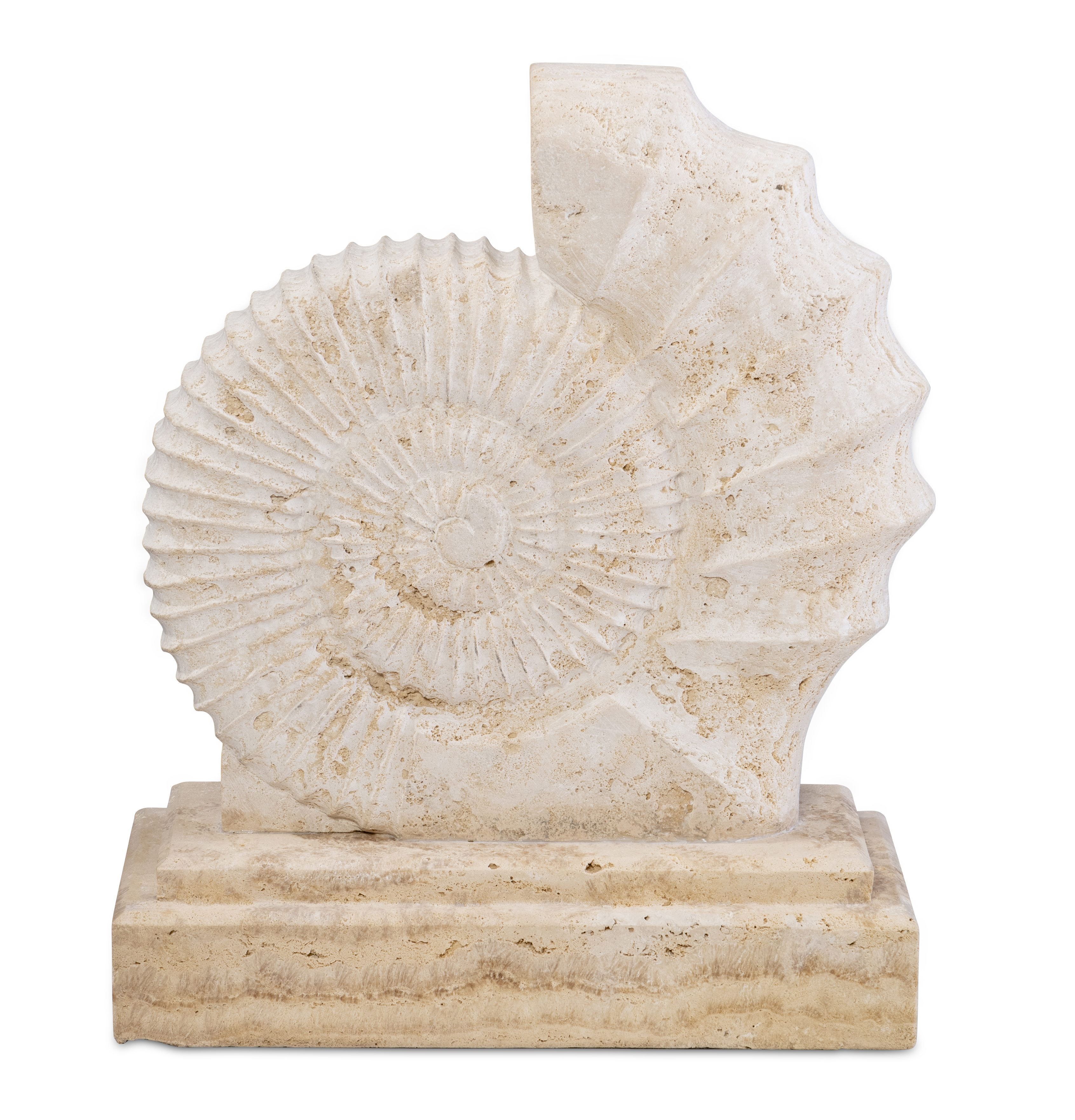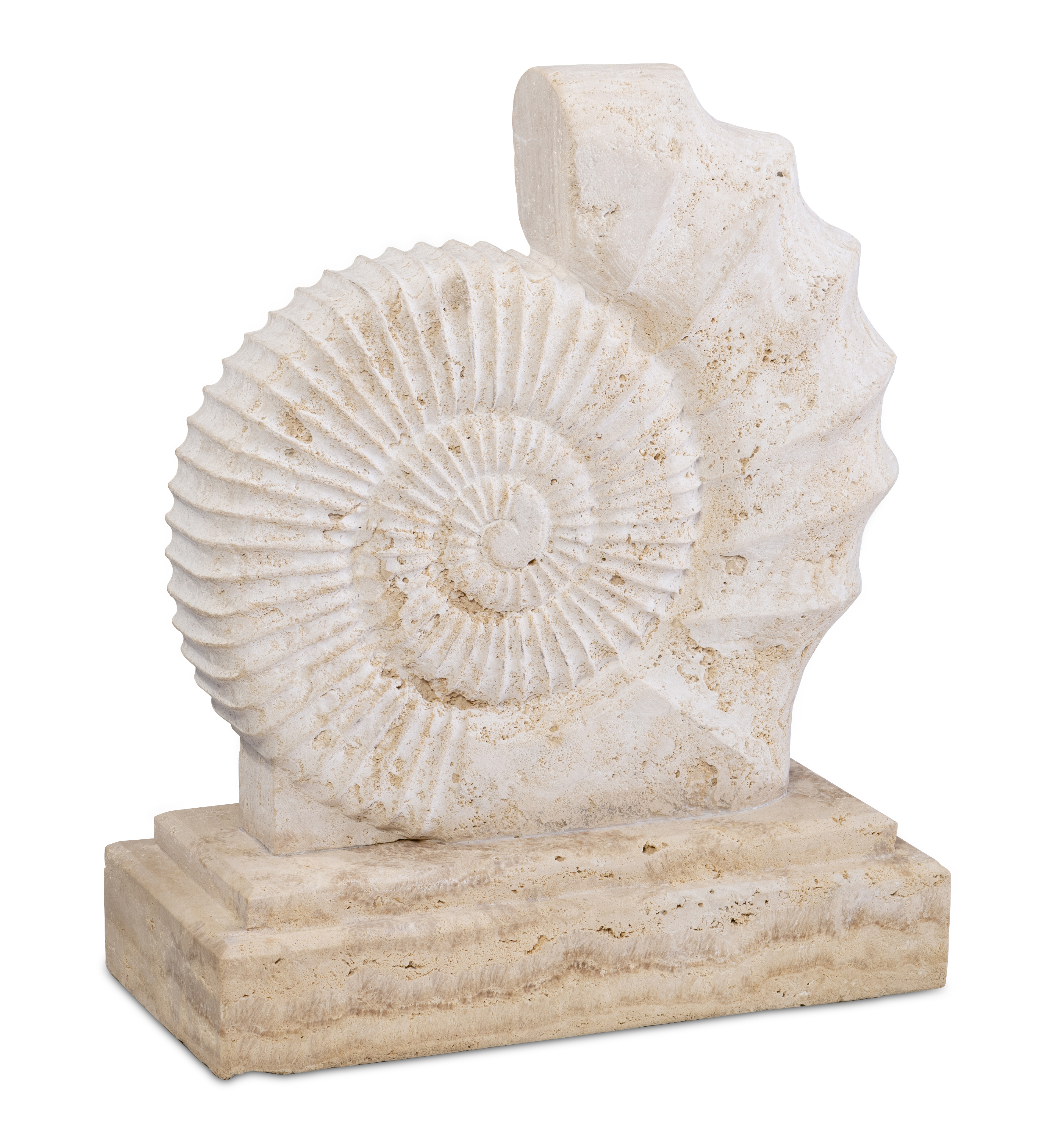 Inspired by the mythic sea nymphs of ancient Greek lore, the Nereid Sculpture captures the quiet poetry of forms shaped by the sea. Carved from warm travertine, the spiraling shell-like motif evokes fossils and ocean relics long preserved in stone, its rhythmic ridges unfolding in graceful symmetry. Resting upon a solid base, the sculpture feels like a fragment of the ancient shoreline—an object that might have been gathered during a Grand Tour along the Mediterranean coast. Both organic and architectural in presence, the piece reflects Maitland-Smith’s enduring appreciation for classical inspiration, storied materials, and the romance of collected treasures.