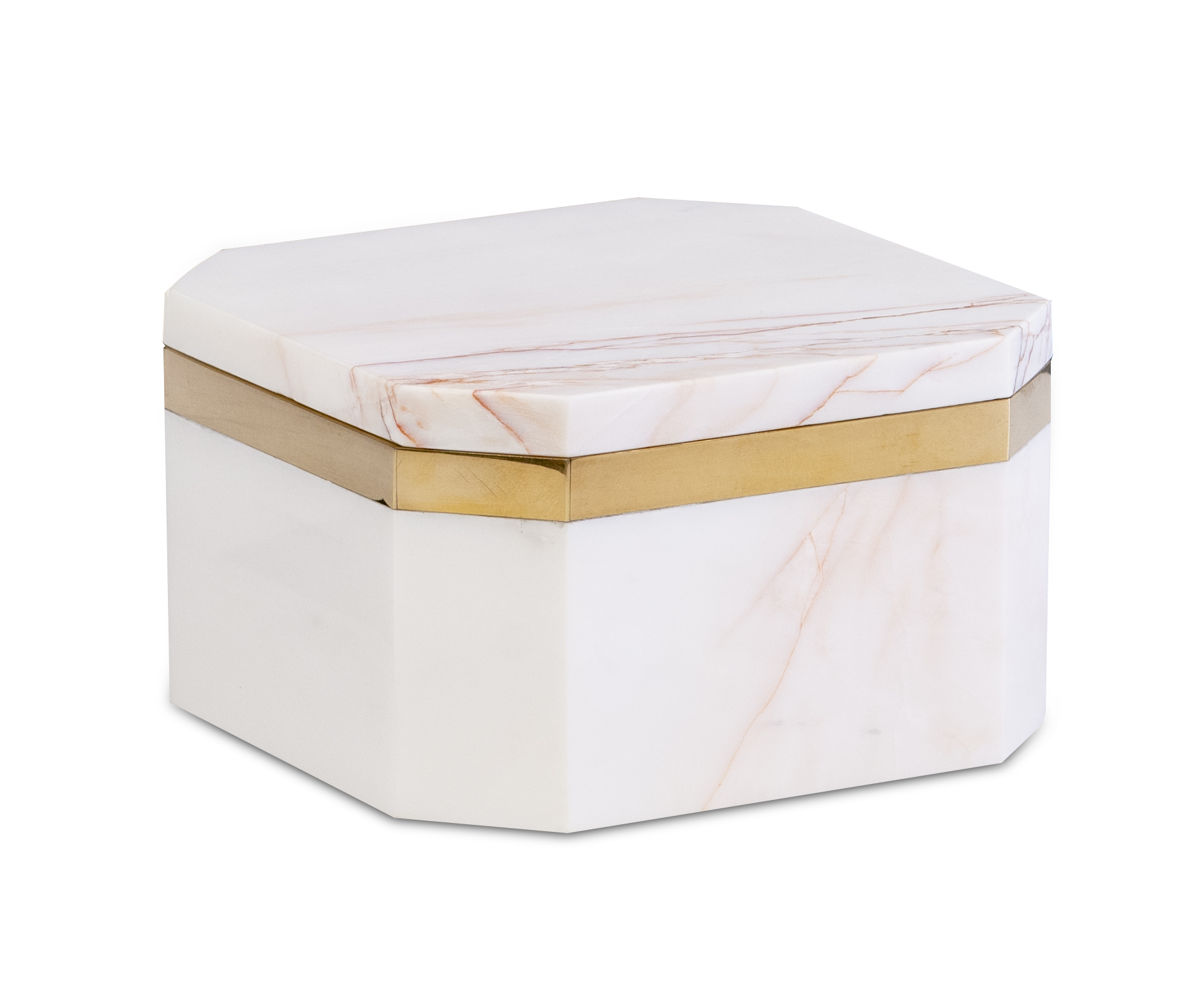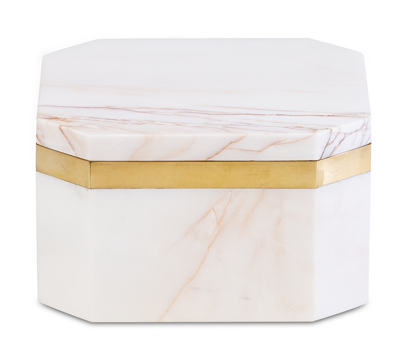 Carved from luminous white marble and encircled with a satin brass band, the Octavian Box embodies quiet strength and refined geometry. Its octagonal form recalls the symmetry of ancient temples and celestial charts, while the interplay of cool stone and warm metal creates a striking balance of texture and tone. Elegant in its restraint, this sculptural box offers a timeless resting place for treasured objects.