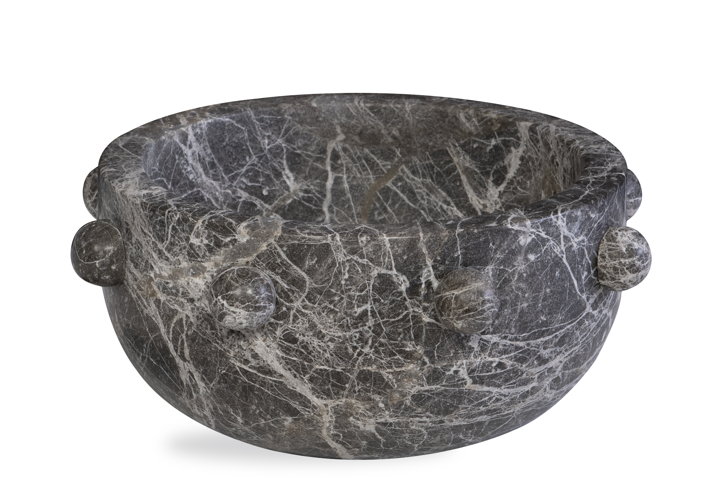 Echoing the artifact-like beauty of ancient vessels, this rounded stone bowl is adorned with polished brass studs that catch the light like scattered relics. The juxtaposition of its hand-textured surface and refined metallic accents evokes a sense of timeless craftsmanship — a modern ode to the ceremonial forms of antiquity. Both decorative and functional, it serves as a striking centerpiece or sculptural catchall.