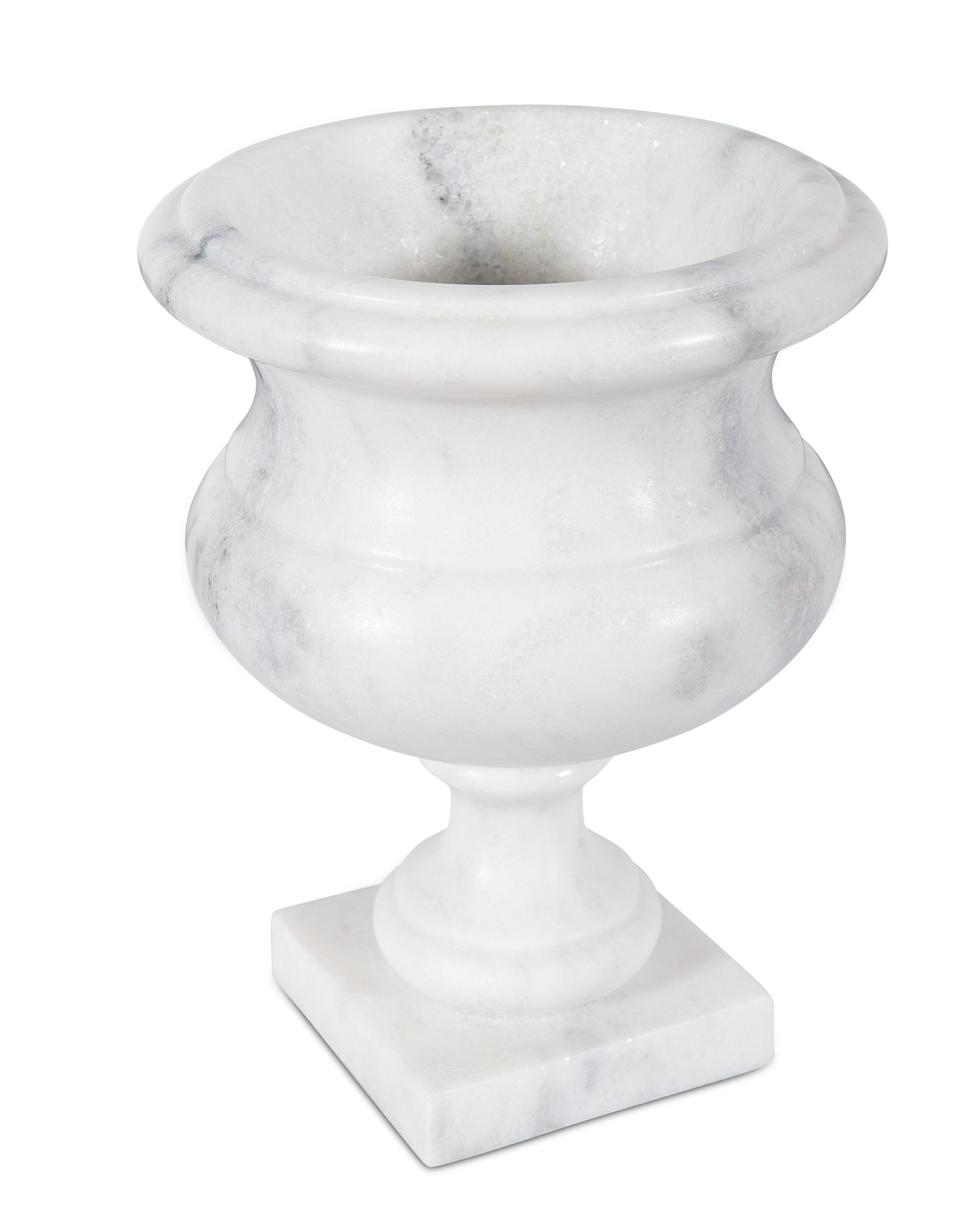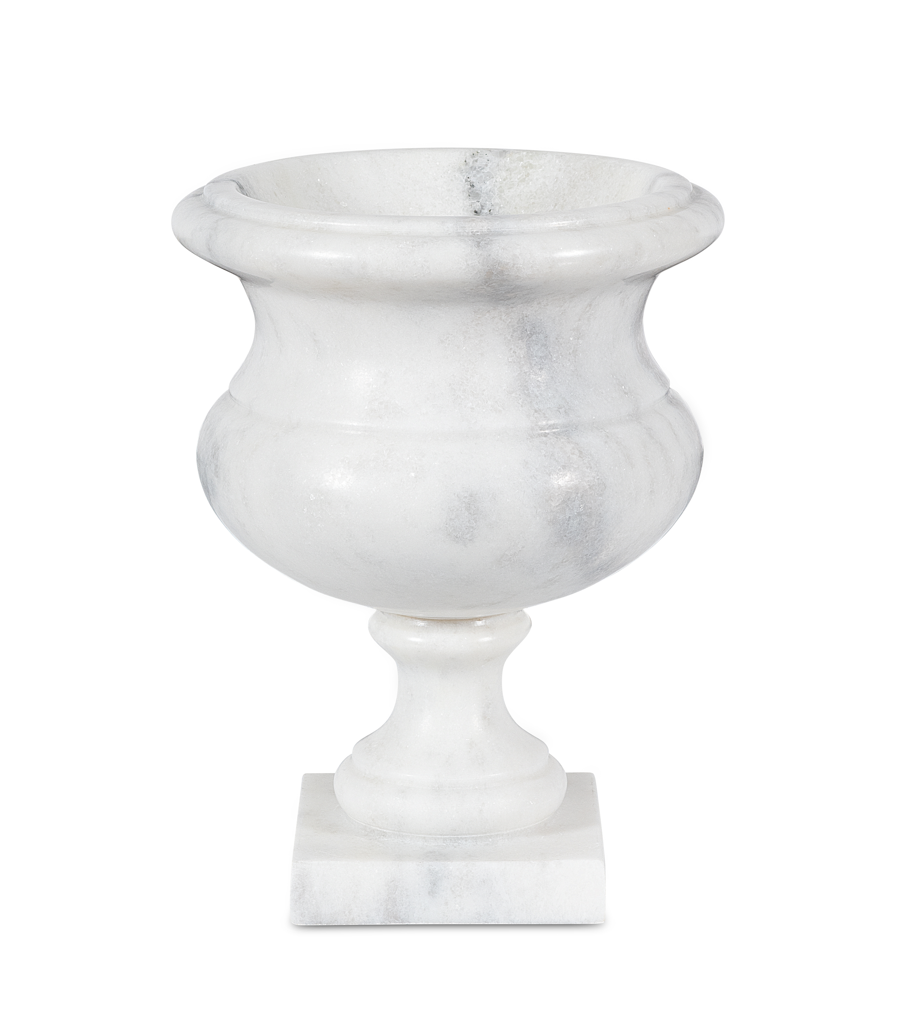 Named for the revered stone quarries of western India, the Ambaji Vase celebrates the quiet beauty of Ambaji marble, prized for its soft ivory tone and subtle natural character. The sculptural urn form, with its gently flared rim and pedestal base, lends the piece a timeless architectural presence that recalls classical garden vessels and collected antiquities. Natural variations in the marble ensure each example carries its own unique expression of the stone. Both decorative and sculptural, the vase reflects Maitland-Smith’s enduring appreciation for storied materials and timeless form.