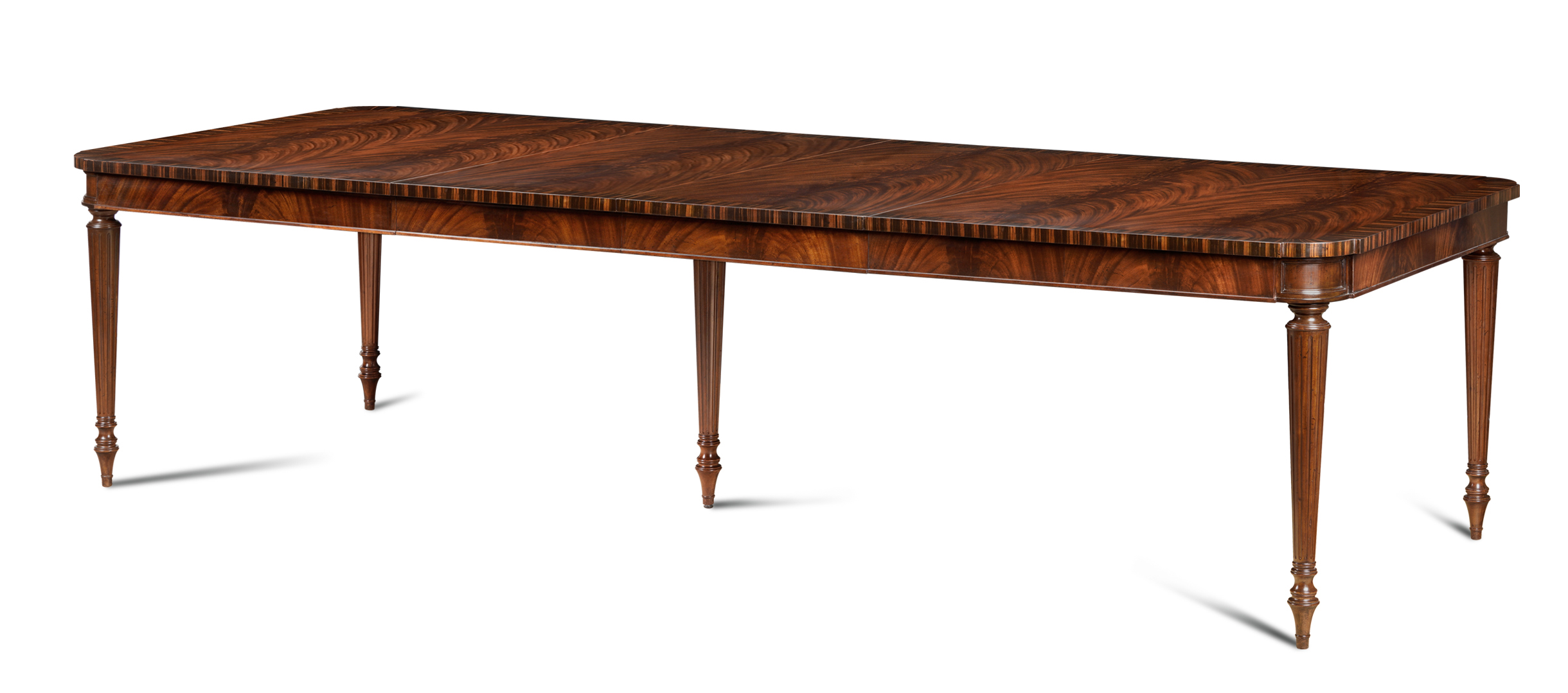 Six legged Crotch Mahogany and Amara wood dining table with two 22" leaf extenders.
