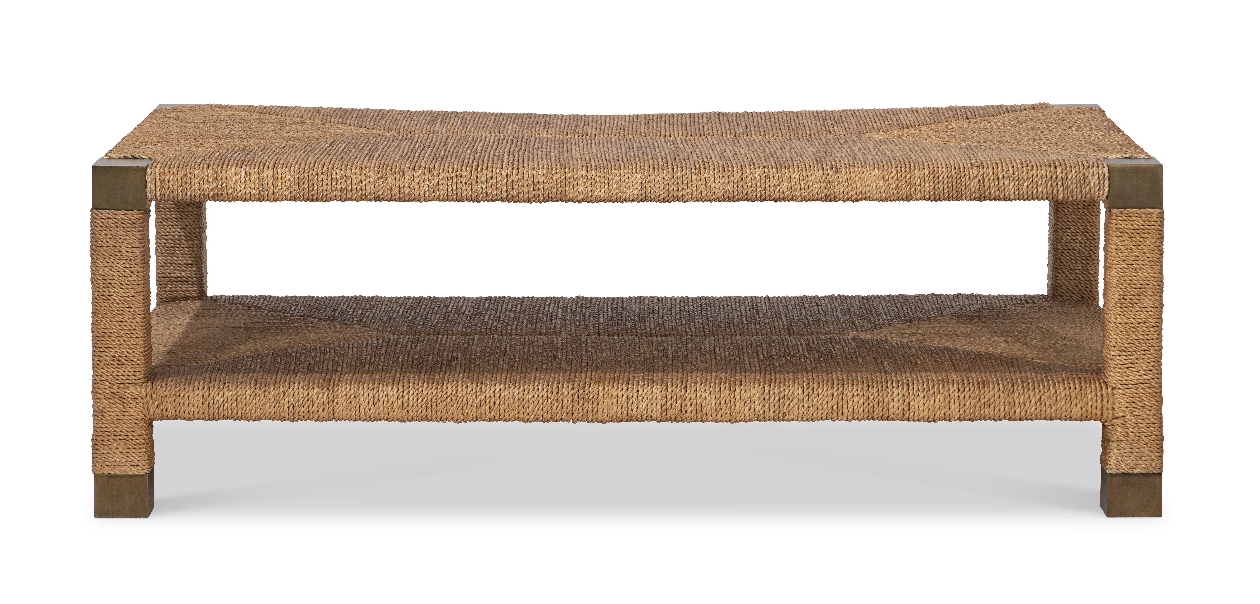 Artfully woven and impeccably composed, this two-tier coffee table celebrates texture as form. The frame is meticulously hand-wrapped in natural fiber cord, creating a herringbone pattern that lends both visual rhythm and tactile warmth. Darkened corner caps provide a tailored contrast, grounding the organic materiality in a refined architectural frame. Balanced, understated, and enduringly sophisticated, it exemplifies Maitland-Smith’s mastery of natural luxury.