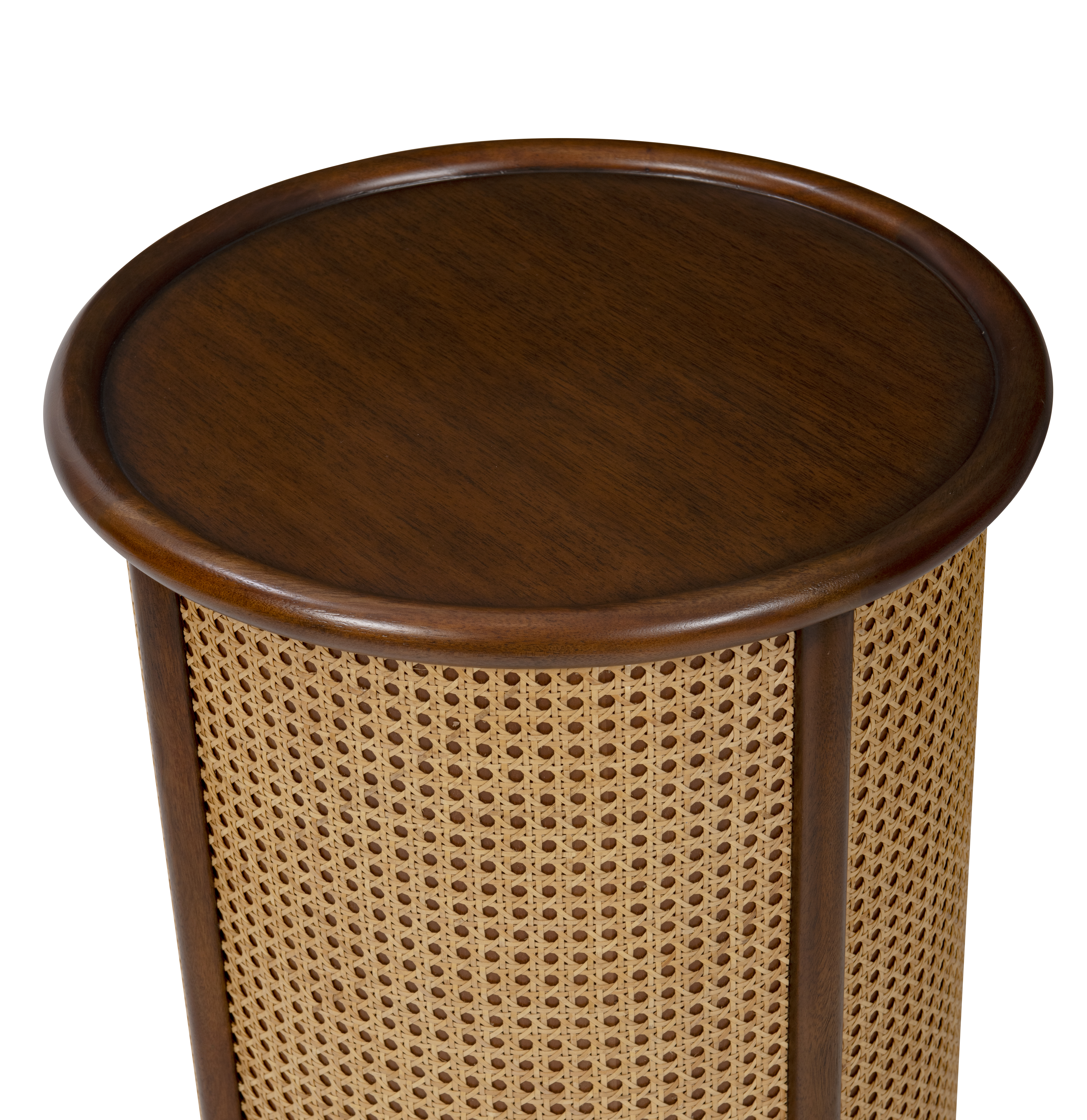 This round end table blends classic form with artisanal texture. Wrapped in open-weave natural cane framed by rich wood molding, it strikes an elegant contrast of light and dark. The simplicity of its cylindrical silhouette highlights the craftsmanship, creating a timeless accent that feels both refined and relaxed.