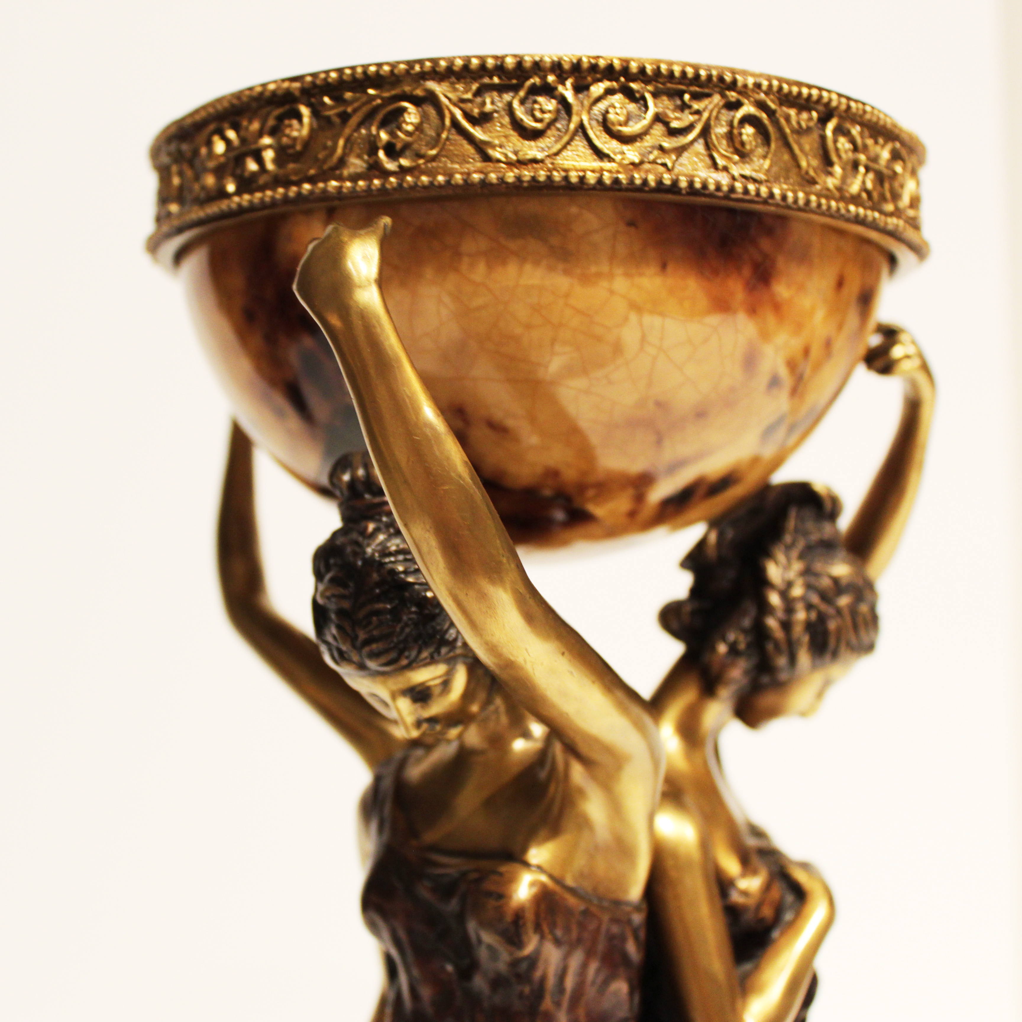 Highlighted Brass Ladies Holding Tiger Penshell Inlaid Box, Marble Base