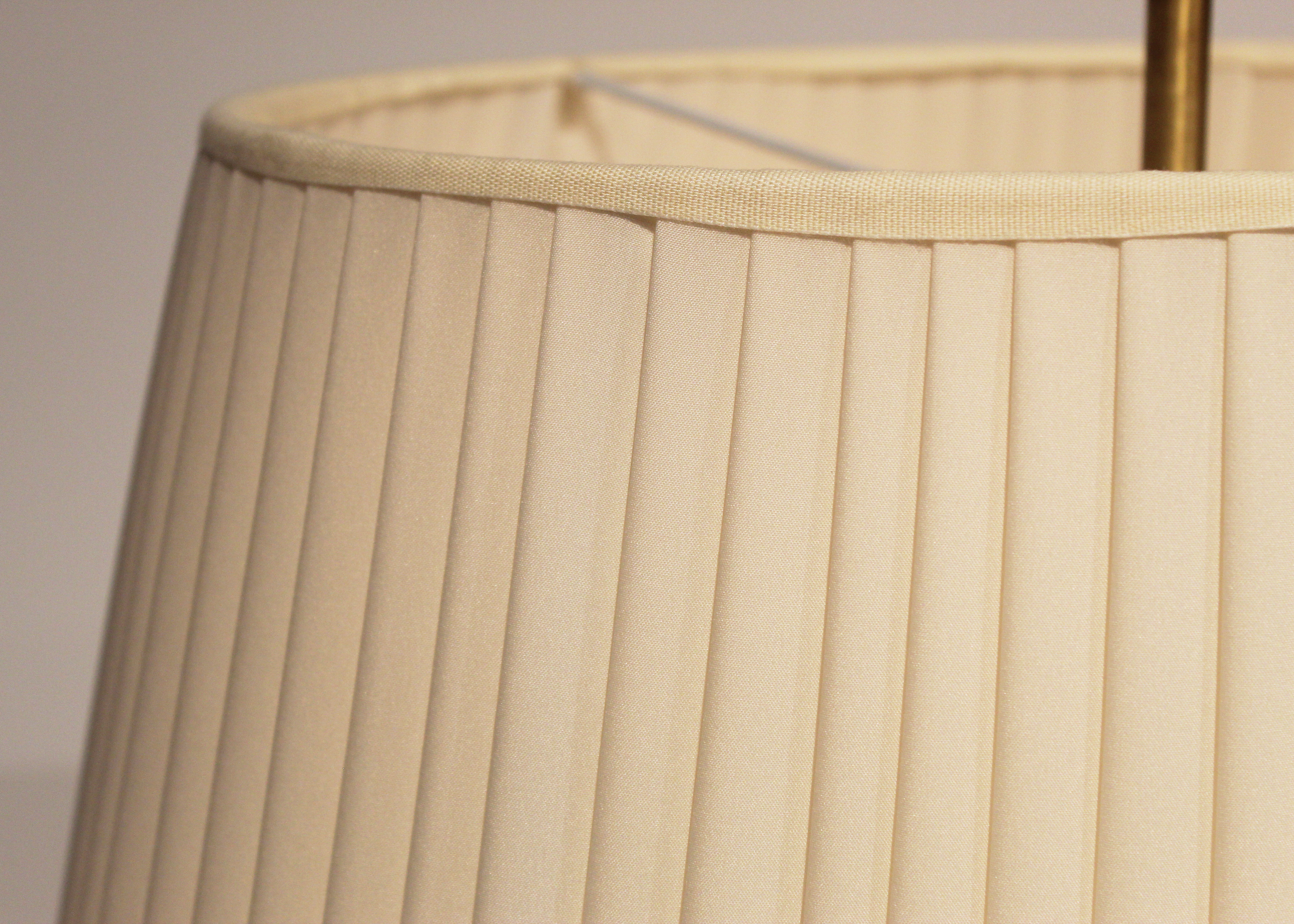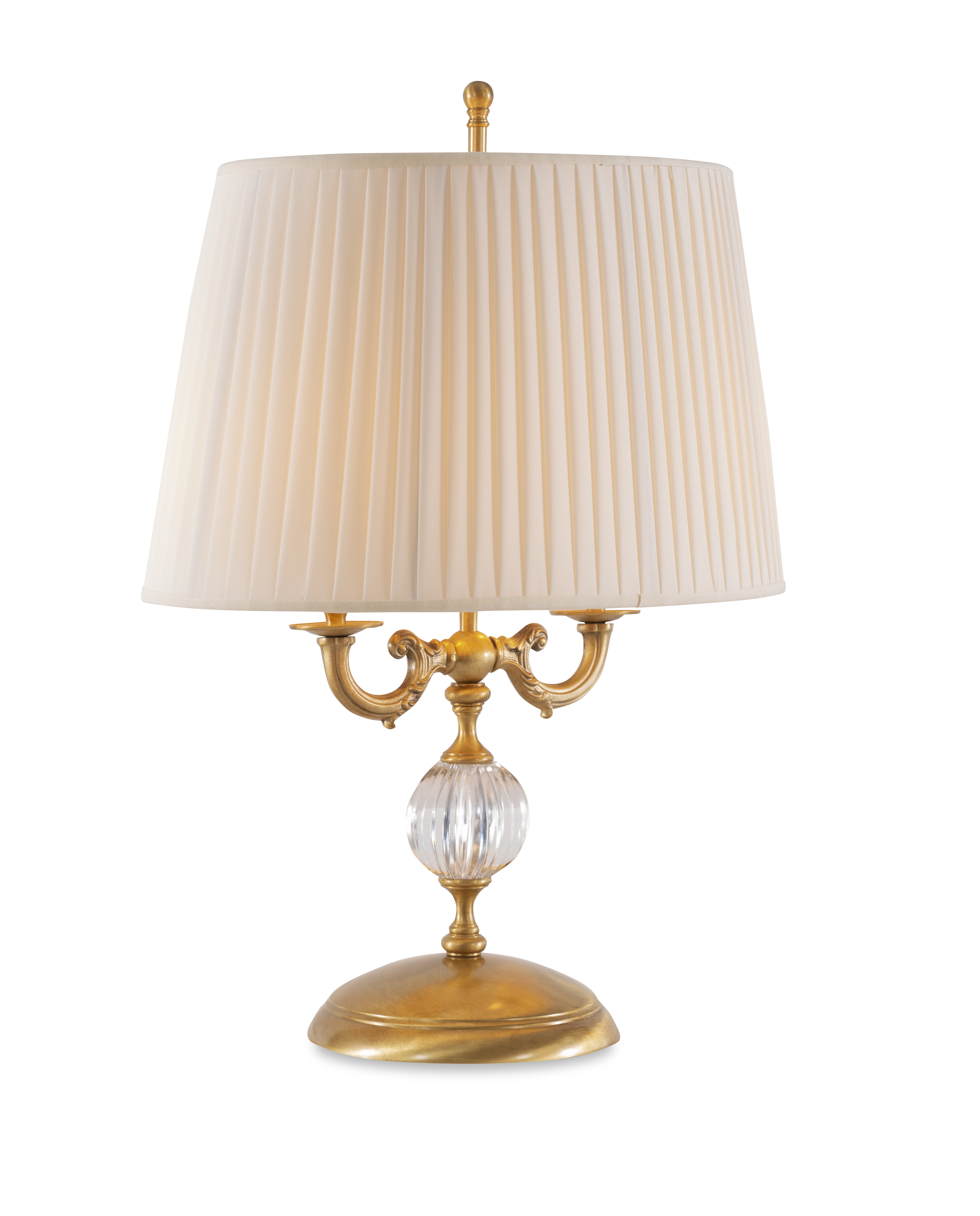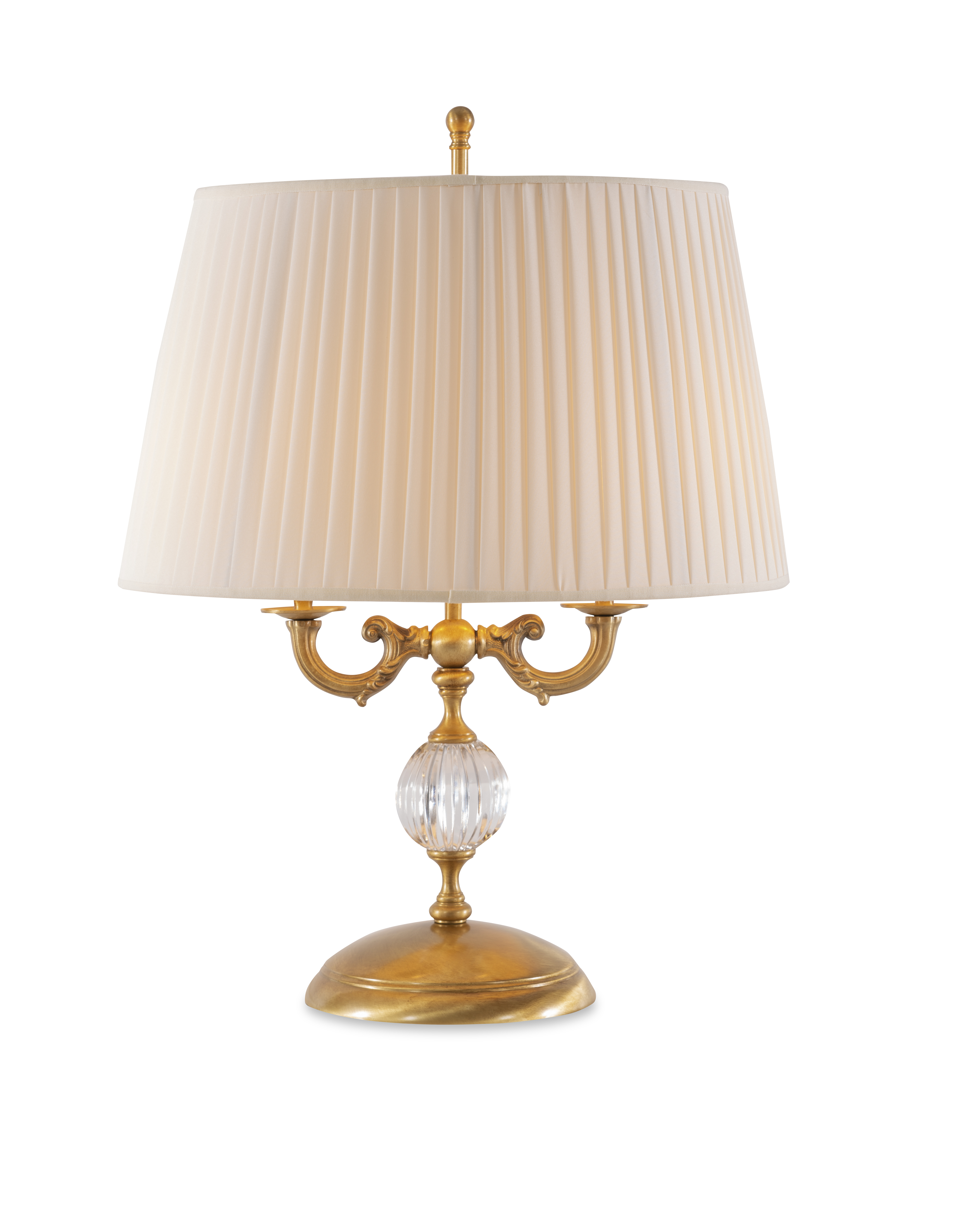 Brass lamp featuring a carved crystal sphere at the base. Plissè shade in an ivory color.