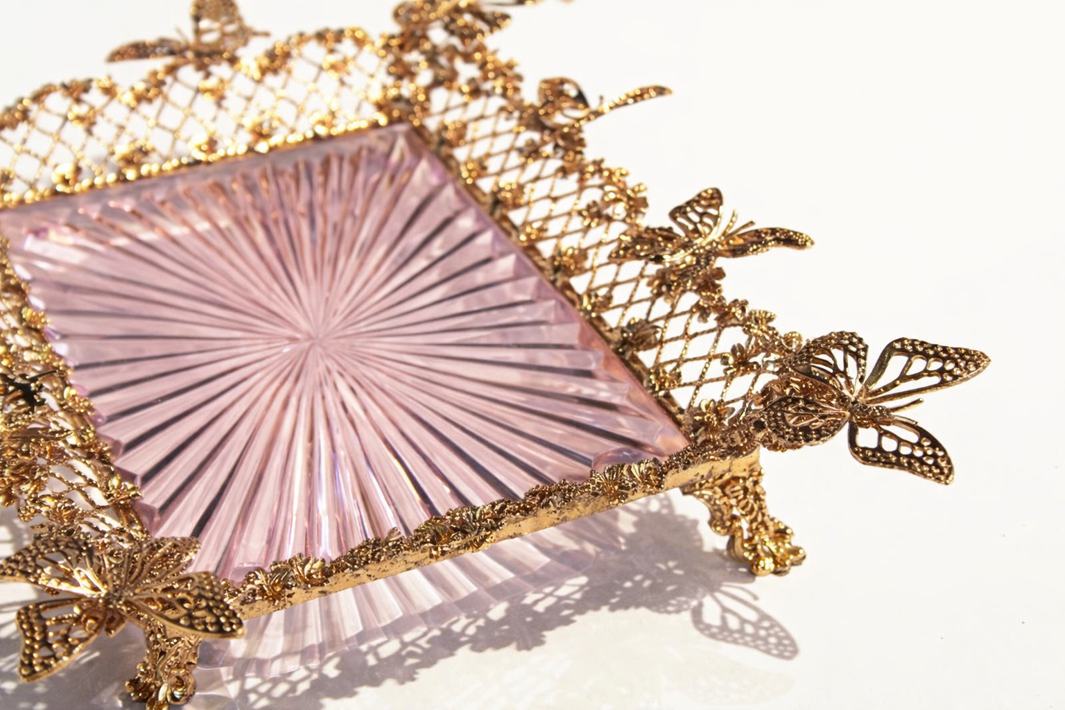 Rectangular Pink Crystal tray, engraved by hand with a central starburst pattern. Metal details, including the delicate butterflies perched on its frame, are lost-wax cast in solid brass and finished in gold.