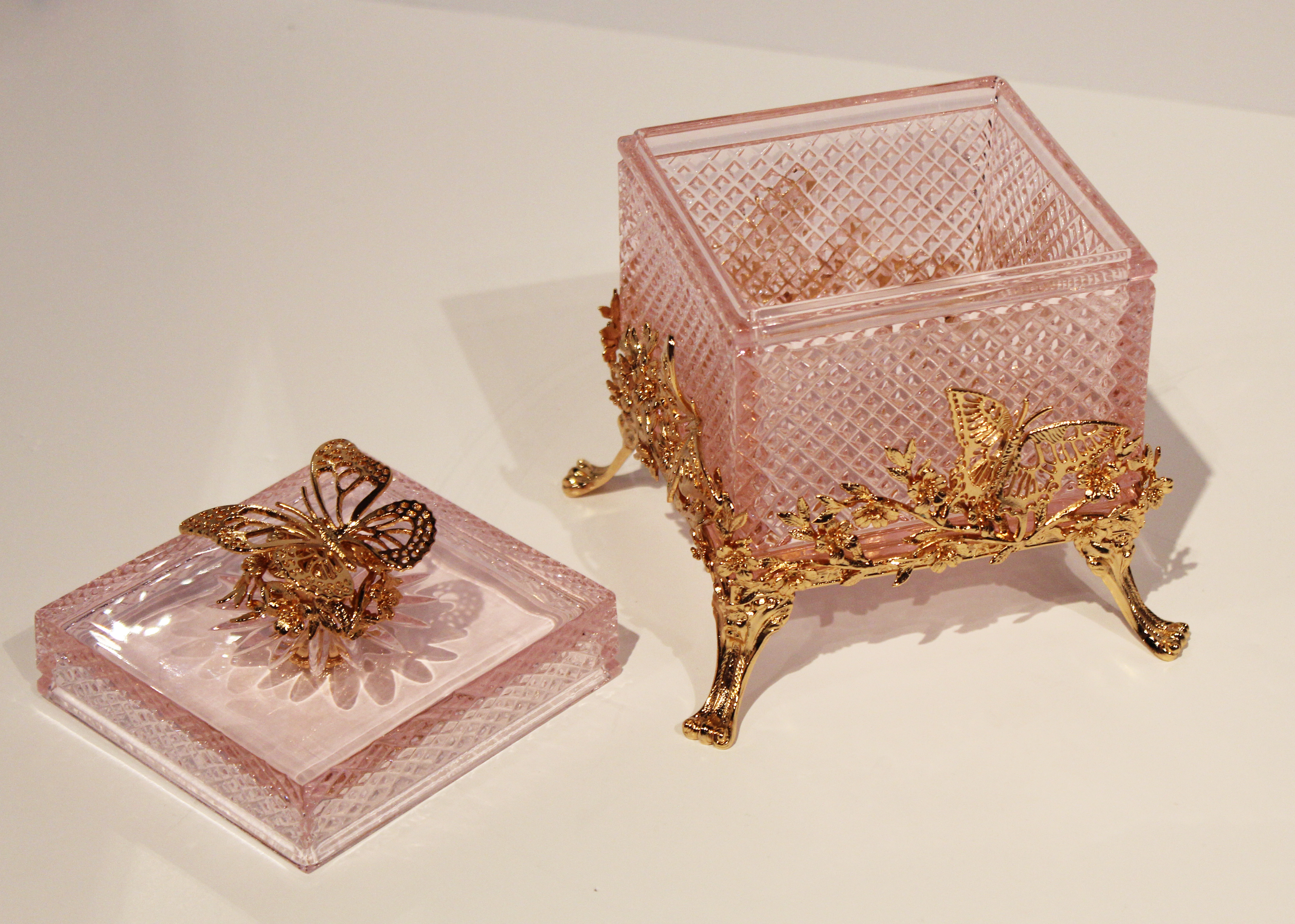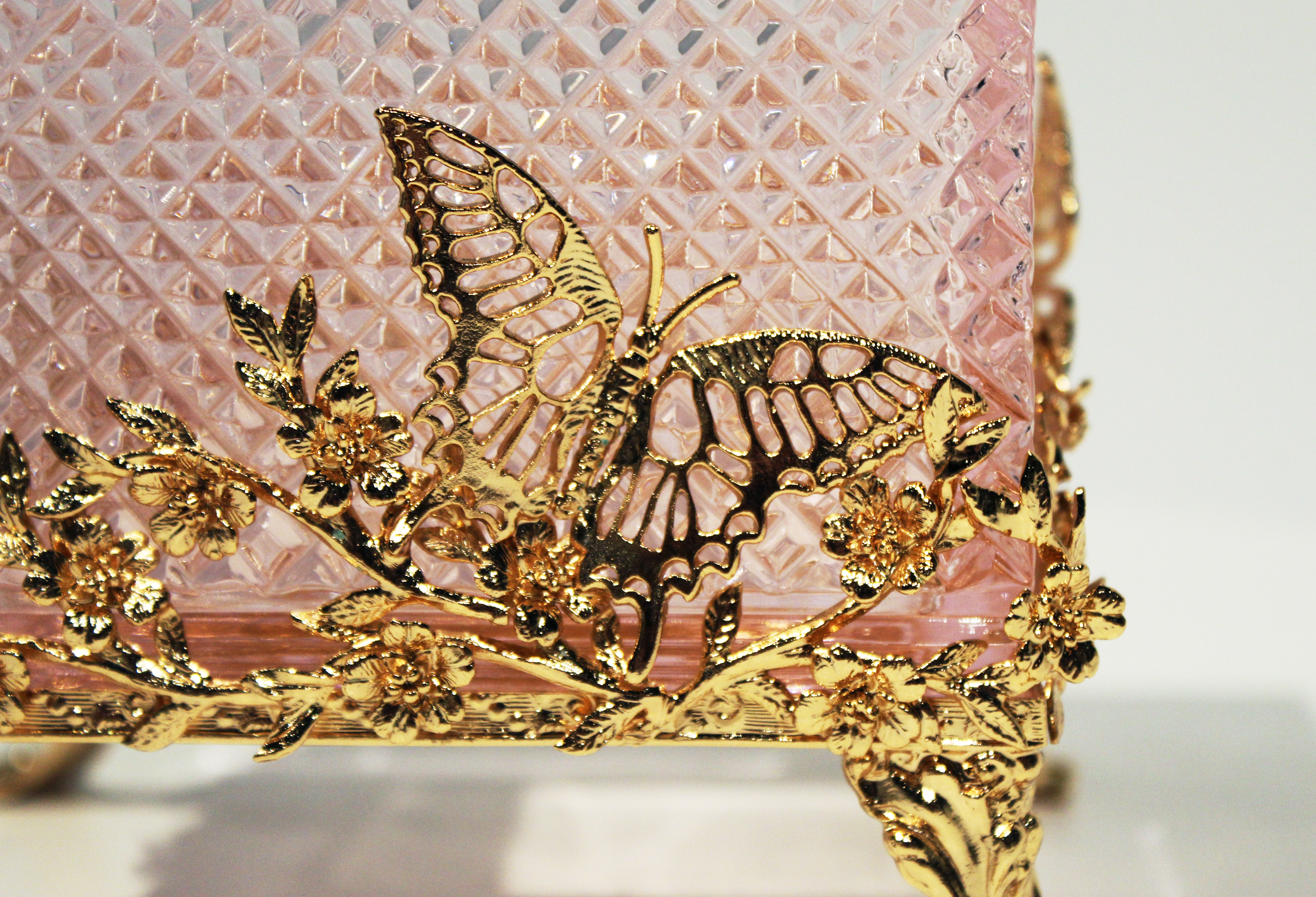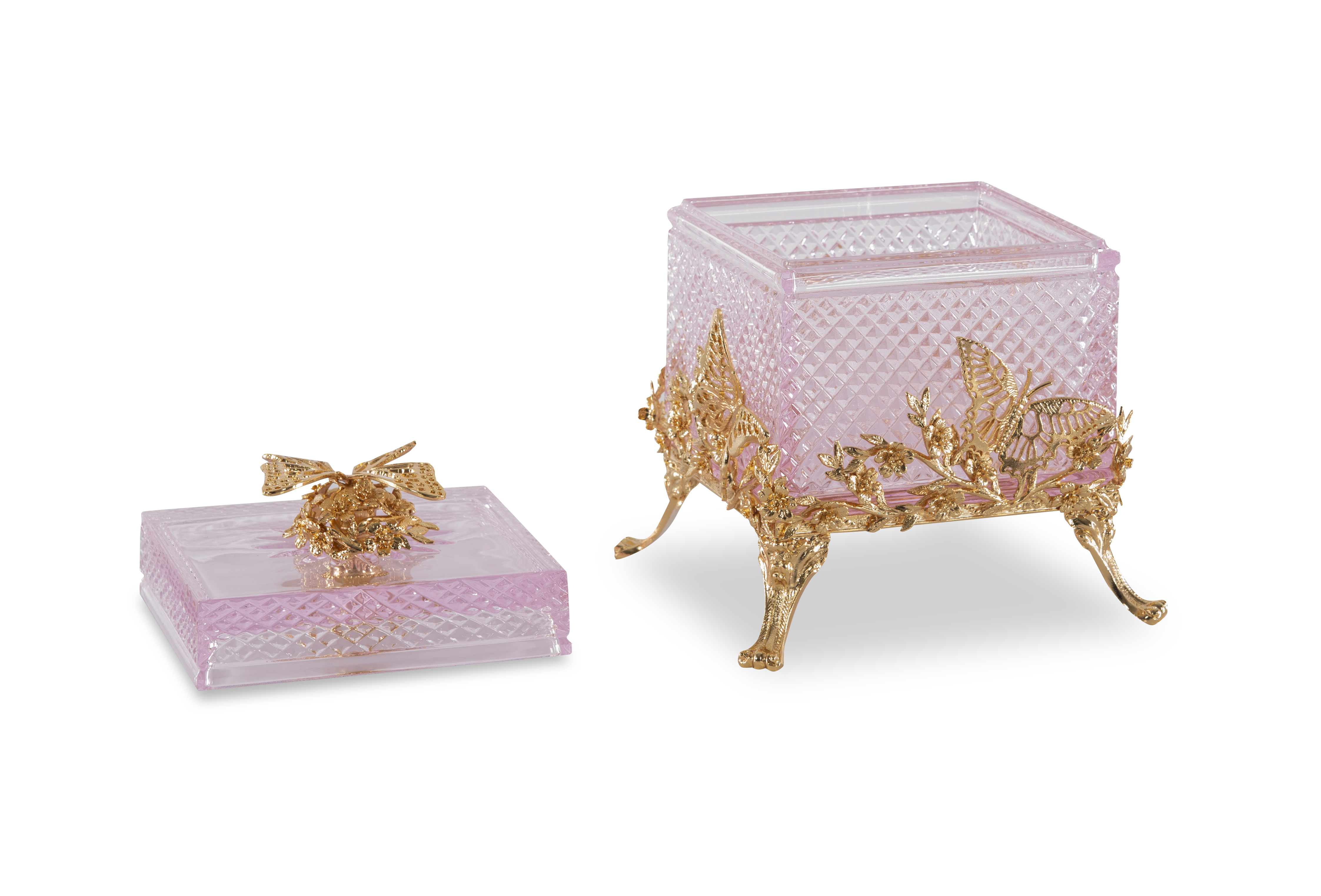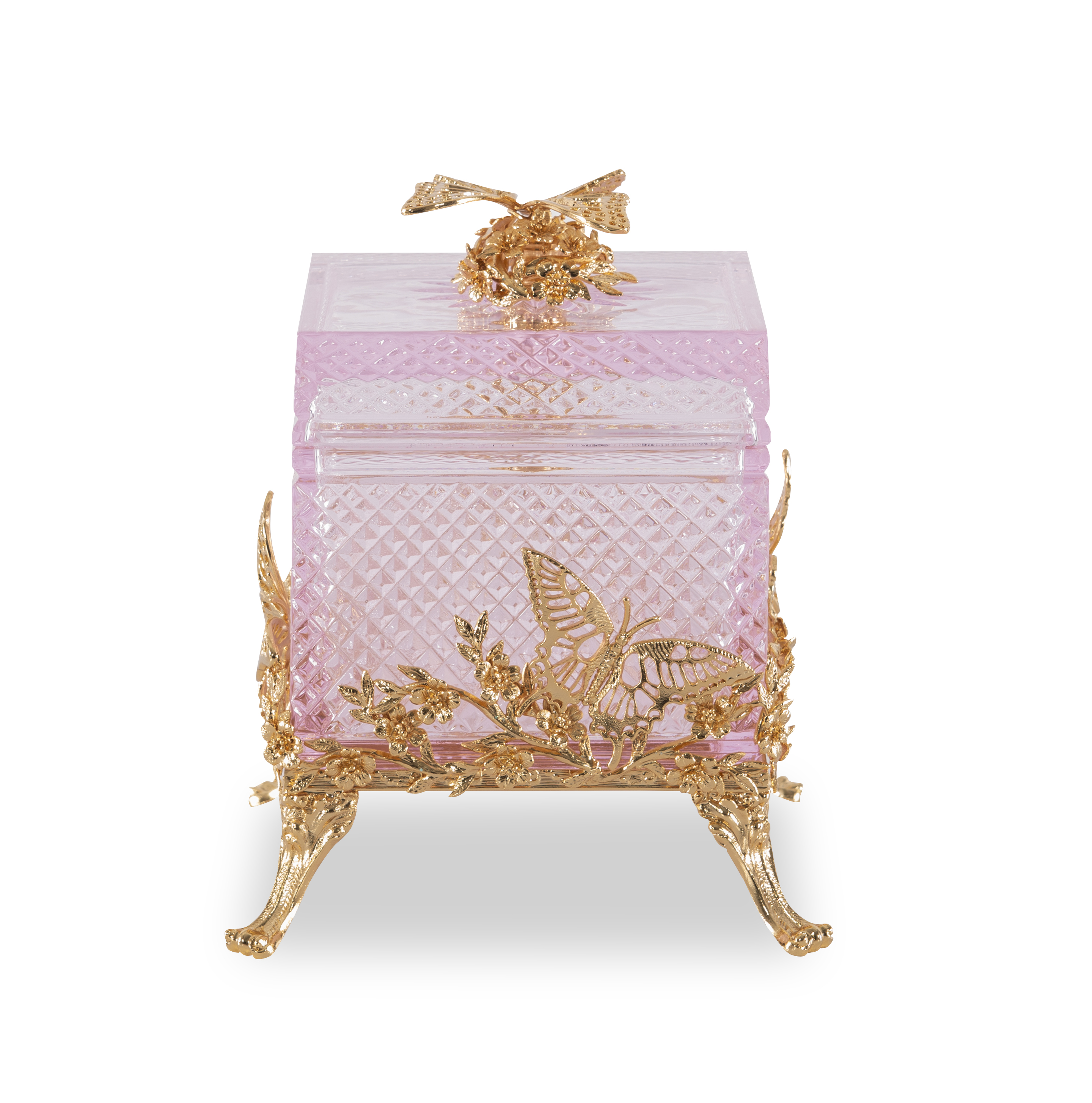 Square Pink Crystal box, engraved by hand with elegant woven patterns. Lost-wax cast solid brass butterflies delicately perch upon its frame, finished in gold.