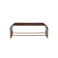 Two-toned walnut burl and birdseye maple waterfall cocktail table. Brass stretcher bars and details.