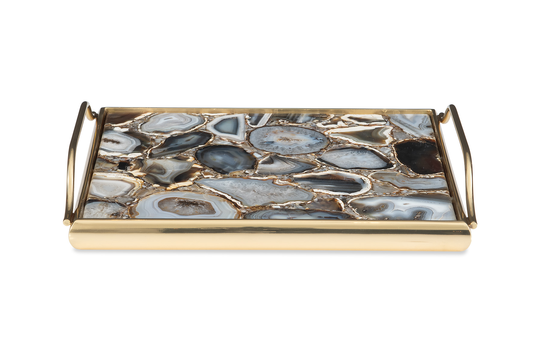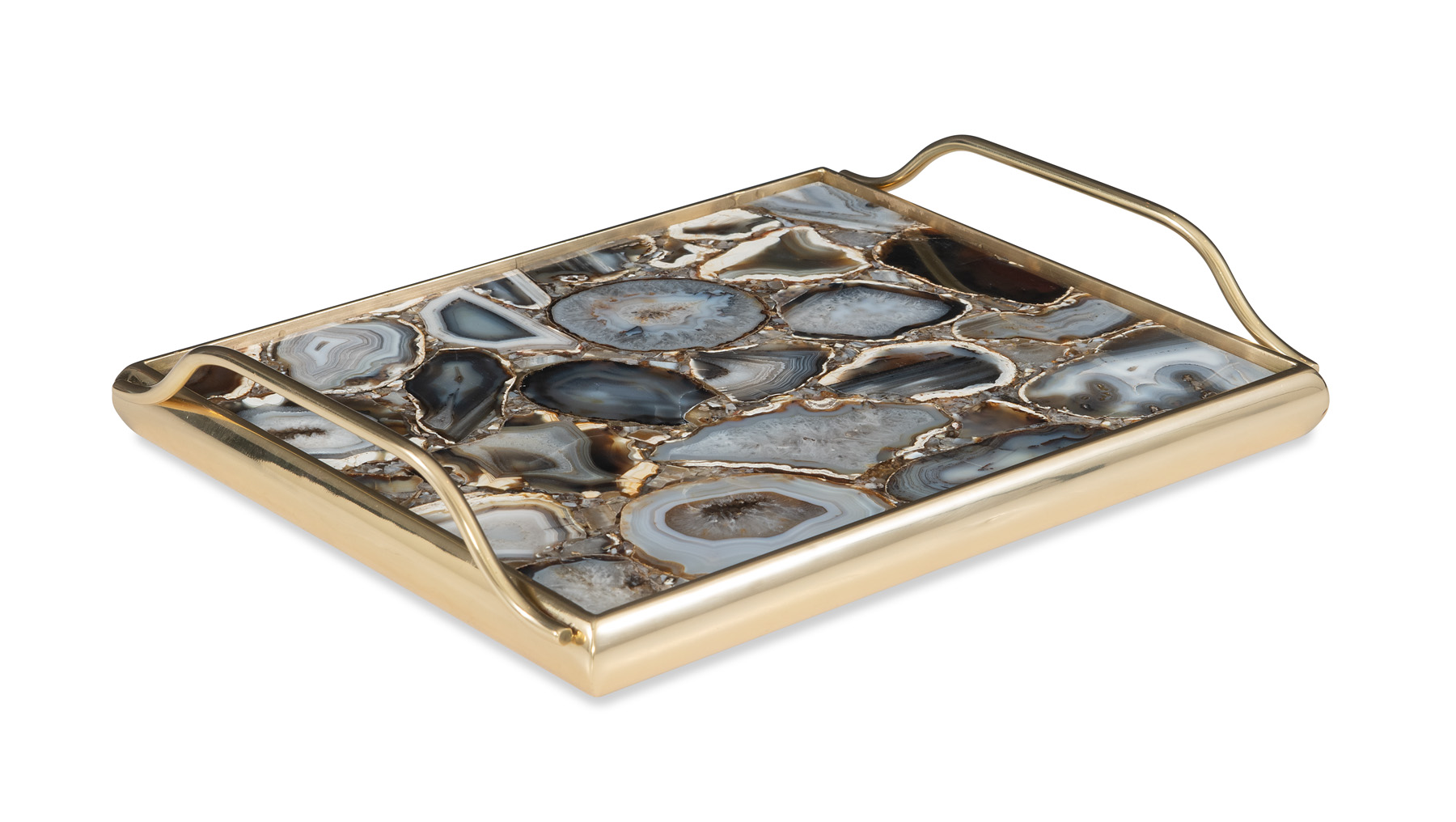 Polished brass and black agate tray. Black agate is a natural stone and some variation of the pattern is a characteristic of the material.