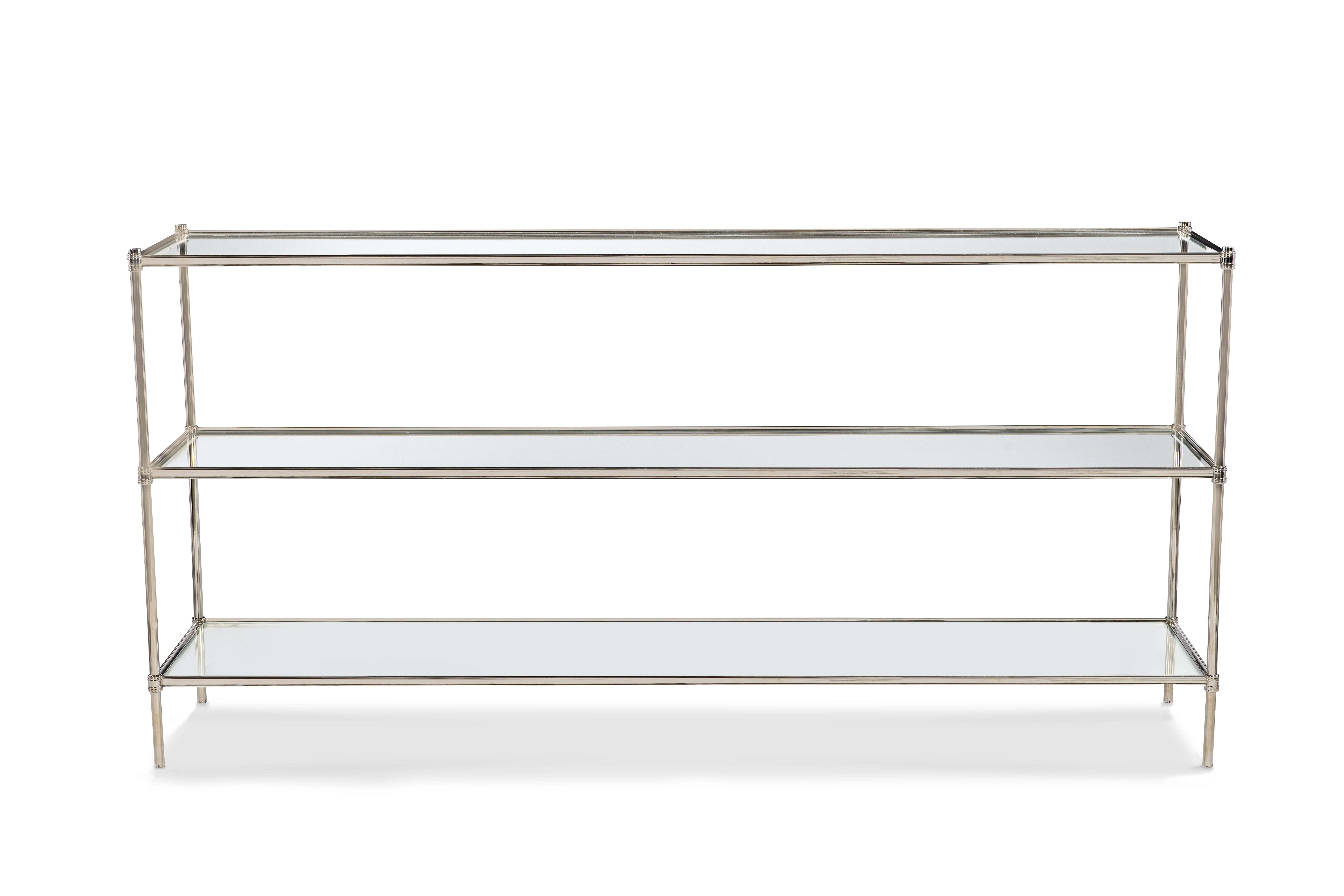 Refined nickel console table with tempered glass shelves. Polished finish.