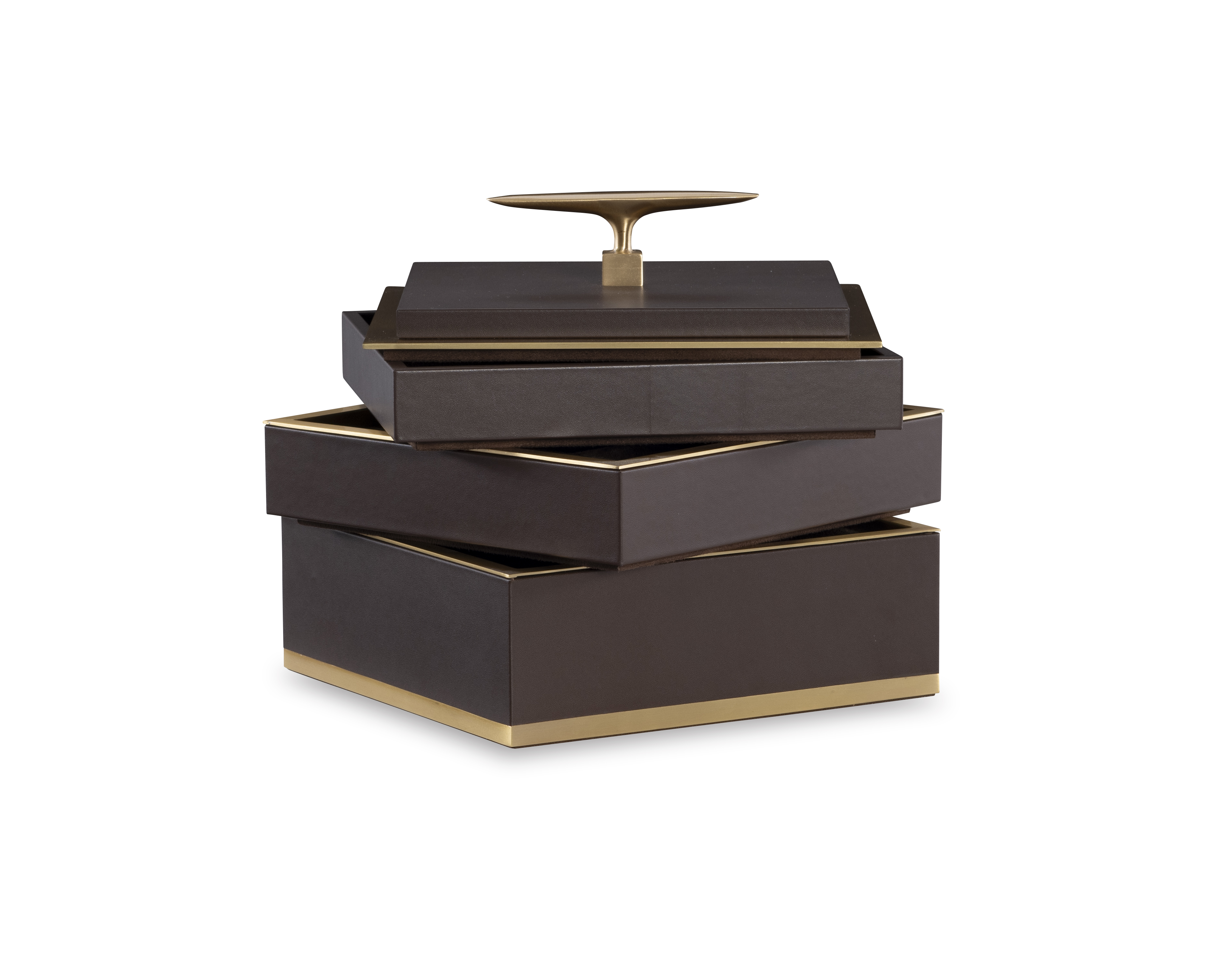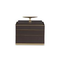Brown leather wrapped jewelry box with a "nautical cleat" handle and details in polished brass. Interior compartments are felt lined and perfectly suited for watches, earrings, bracelets, and other treasures.