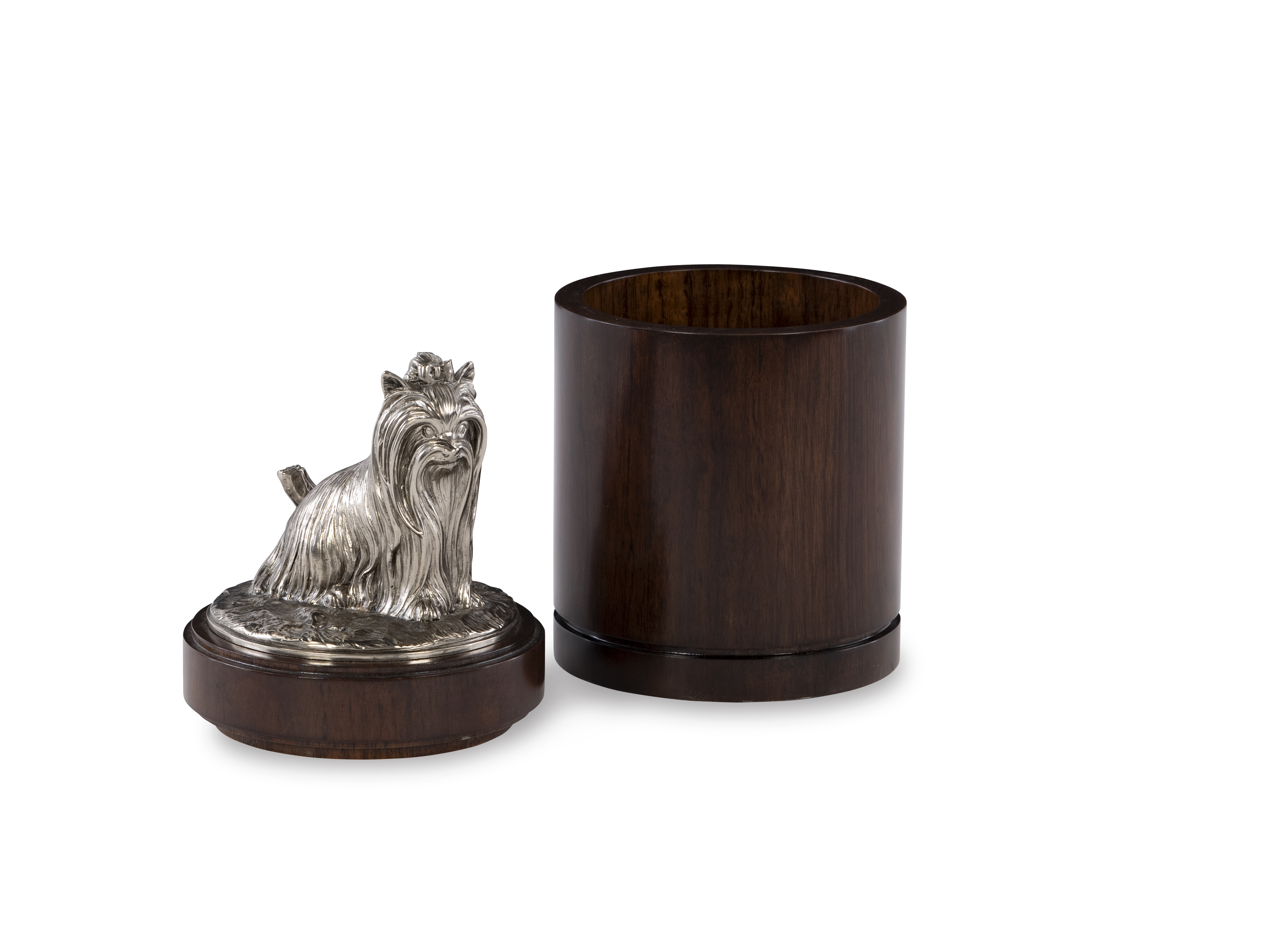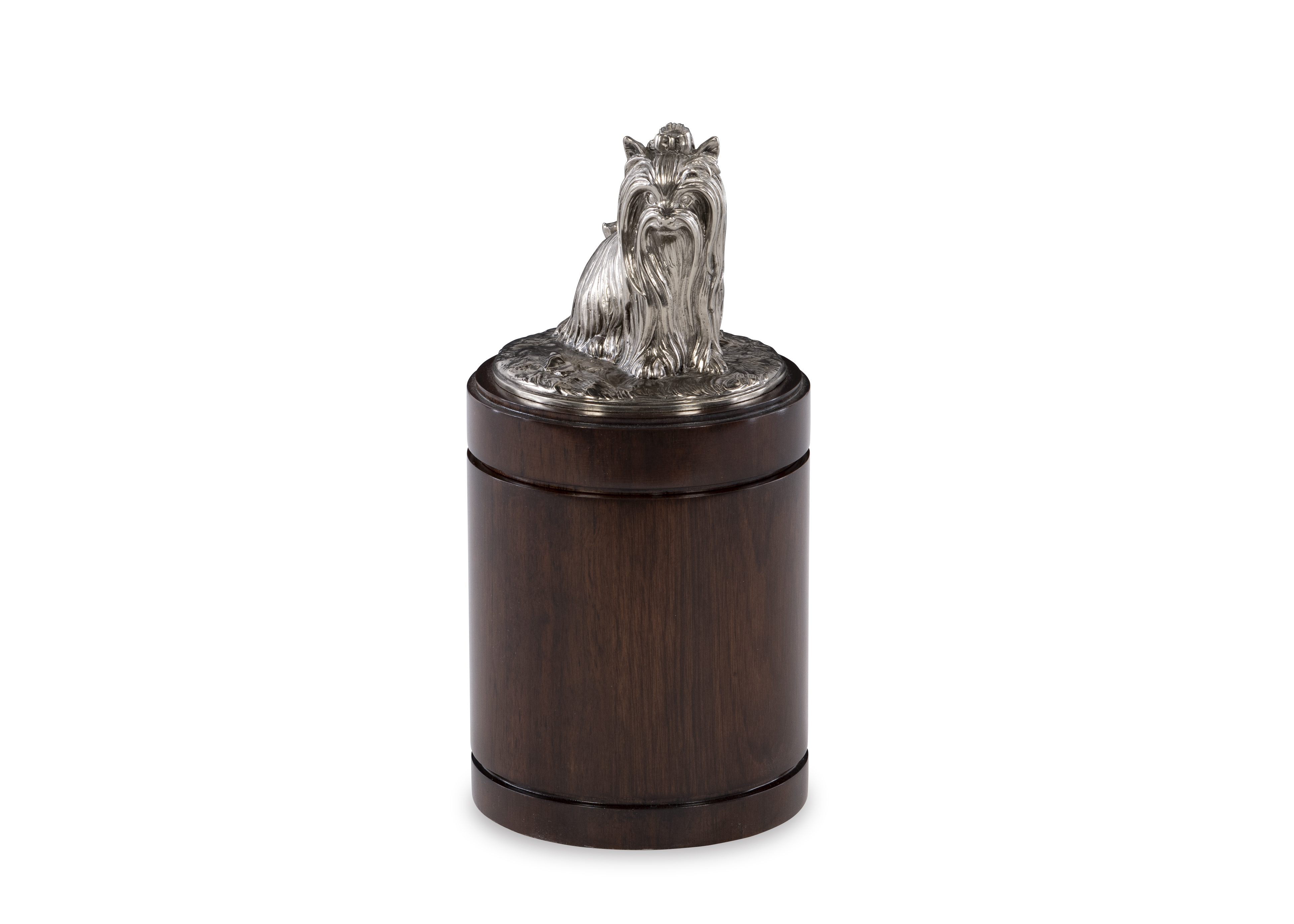 Small walnut canister with a nickel plated brass yorkie sculpture on top.