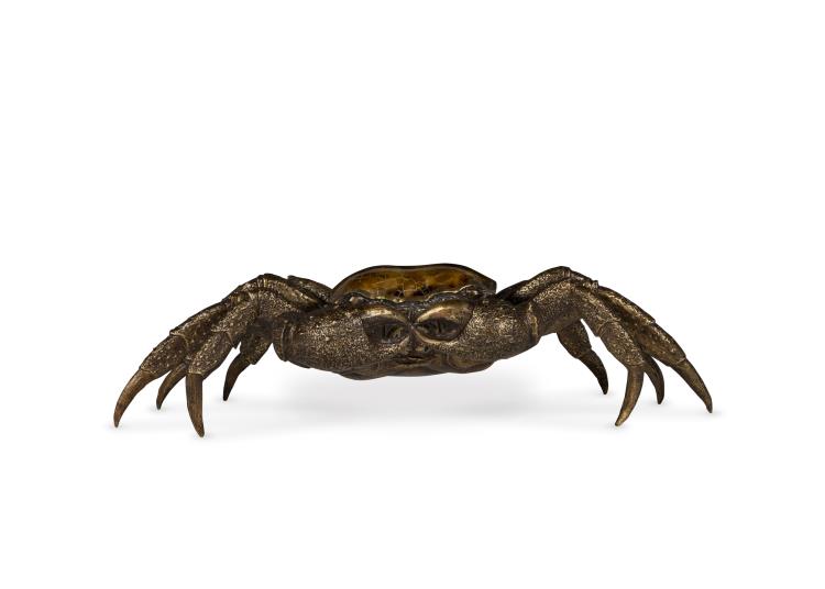 Cast brass crab sculpture with inlaid crazy cut penshell top.