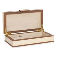 Set of three cream croc leather and walnut stacking boxes. The top two boxes have felt-lined compartments for jewelry or other small mementos. The bottom box is open for larger personal items. Textured brass handle