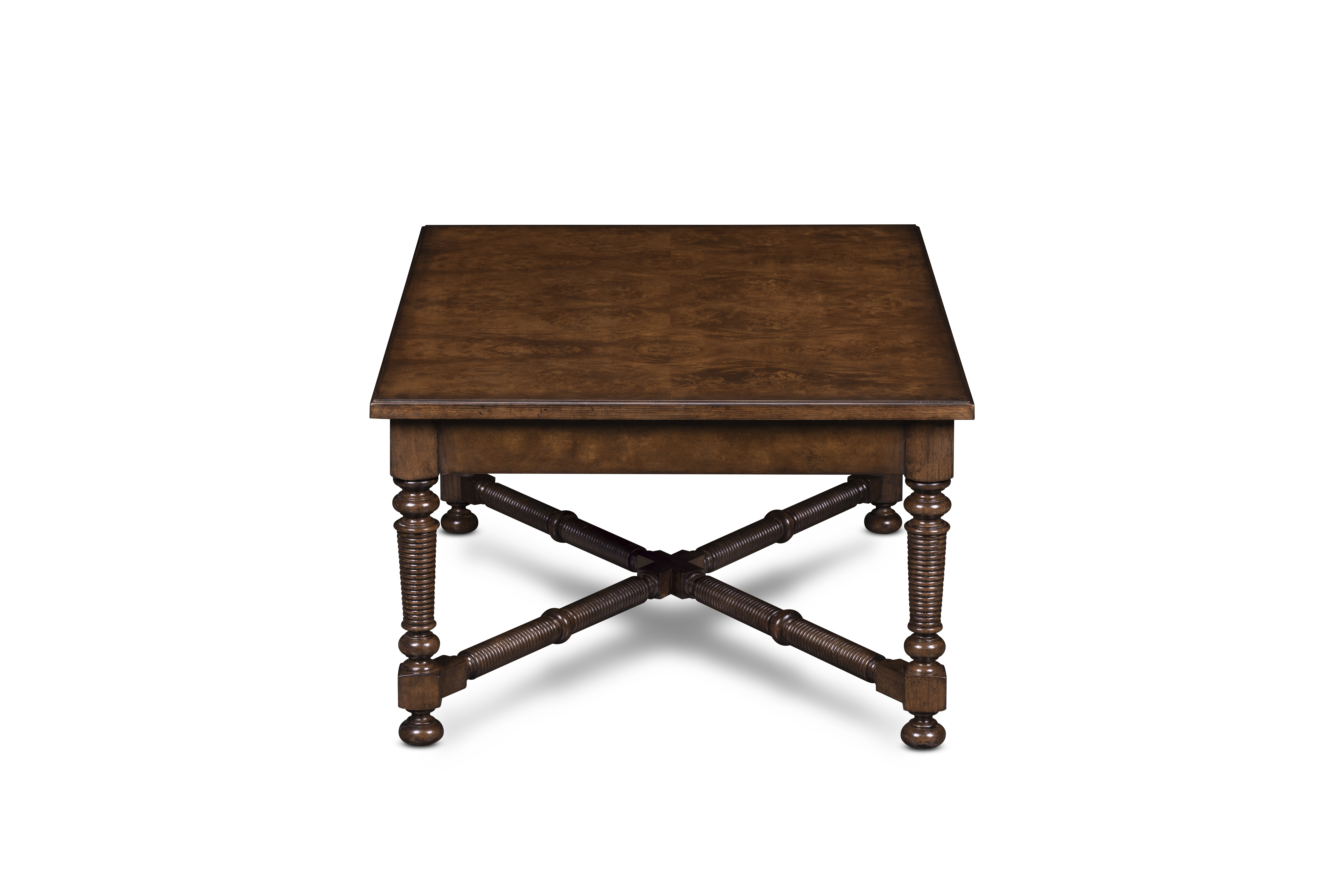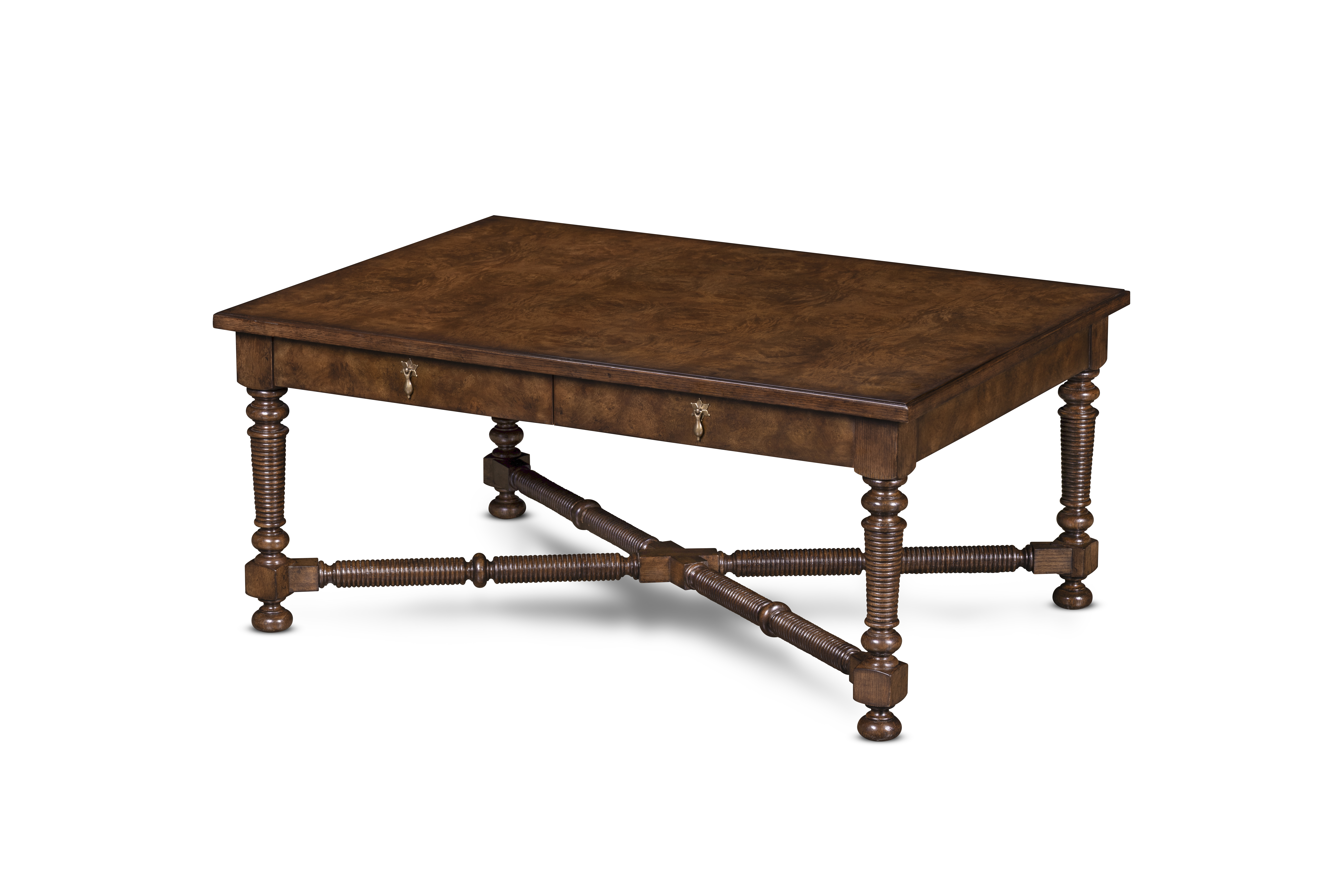 This hand-finished side table reflects devotion to artistry in form and detail. The richly grained oak burl top rests upon turned and ribbed legs joined by a sculptural stretcher—each element shaped and assembled by hand to evoke quiet grandeur. Four drawers with cast-brass pull adds both elegance and utility—an heirloom accent that marries craftsmanship and character.