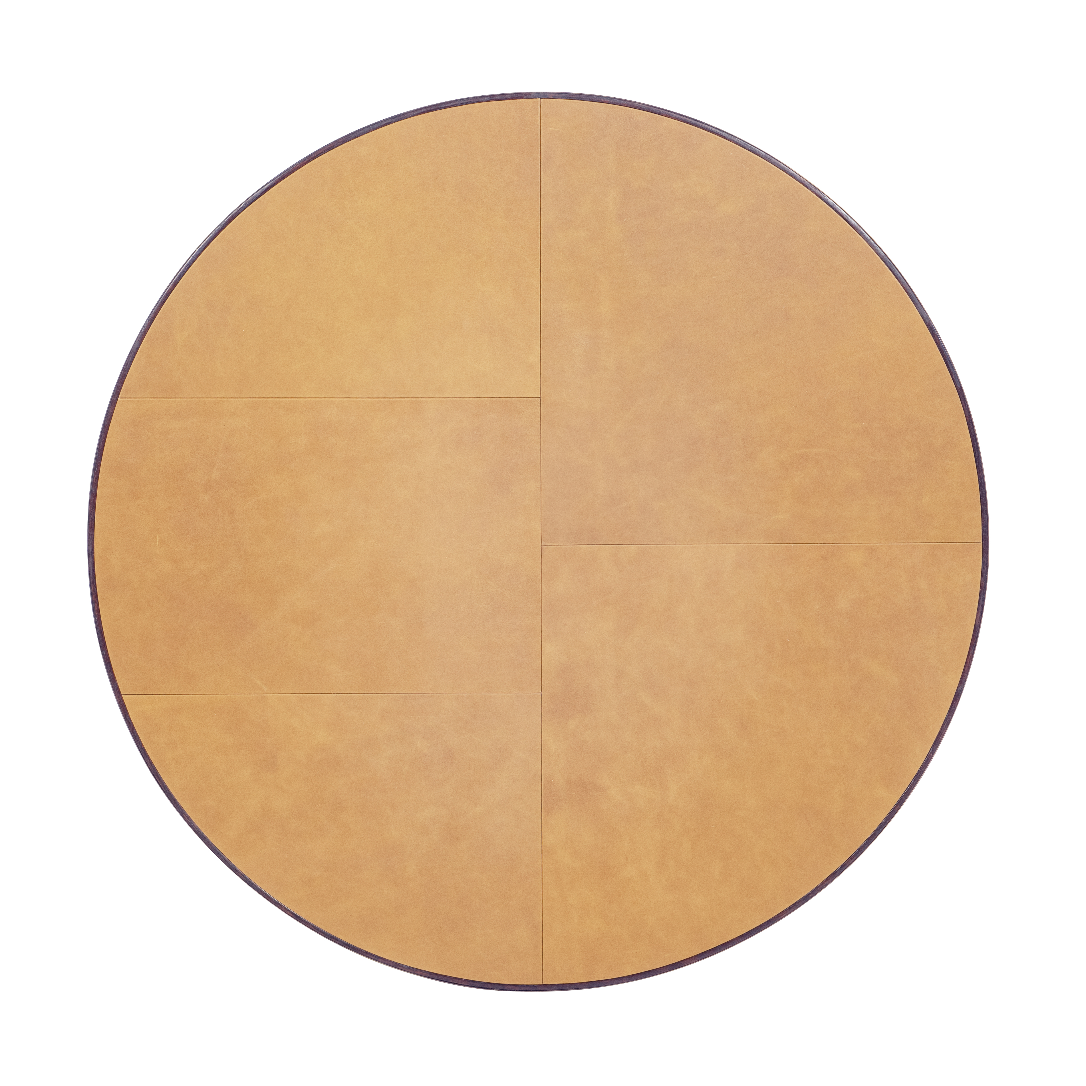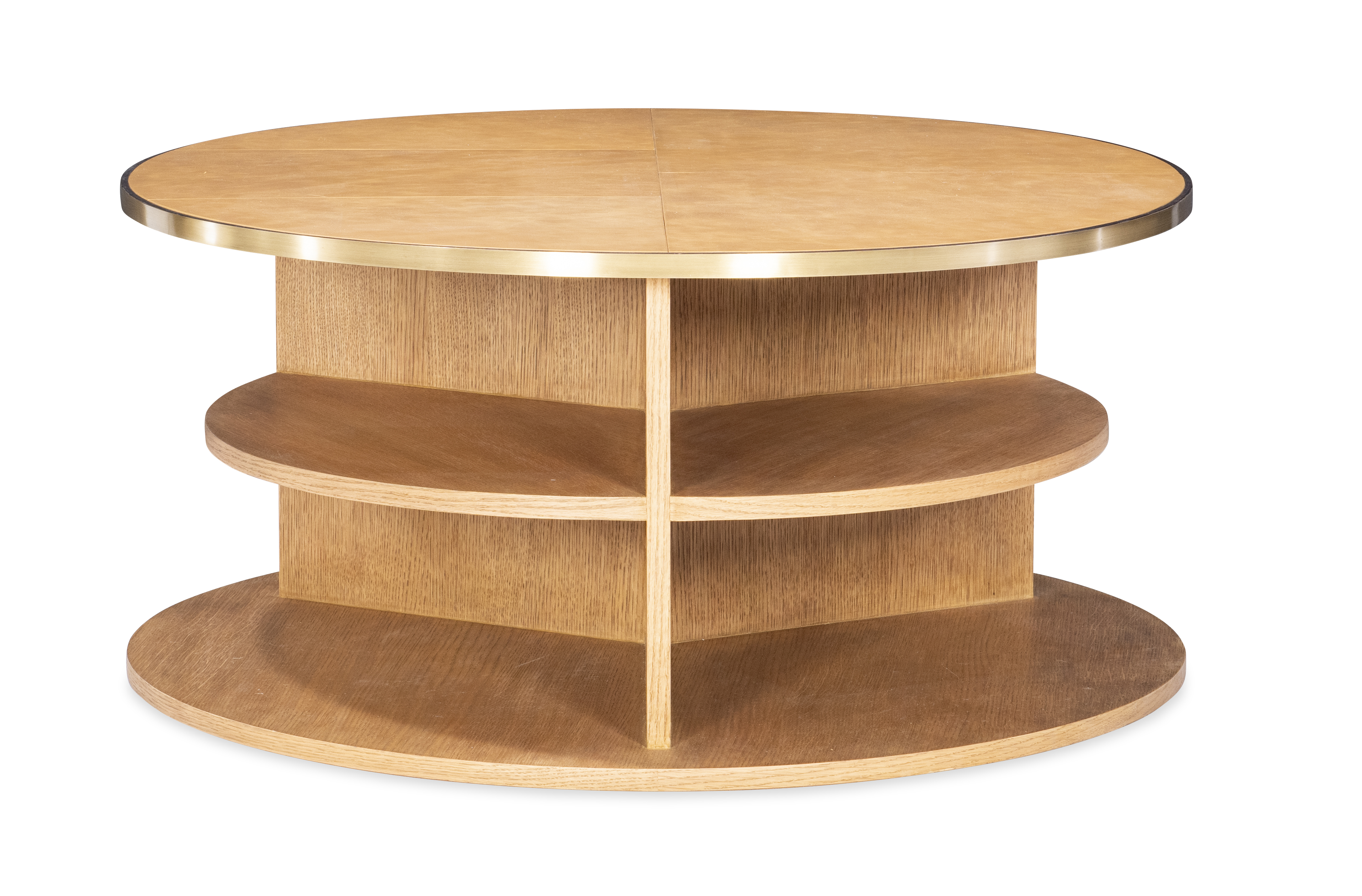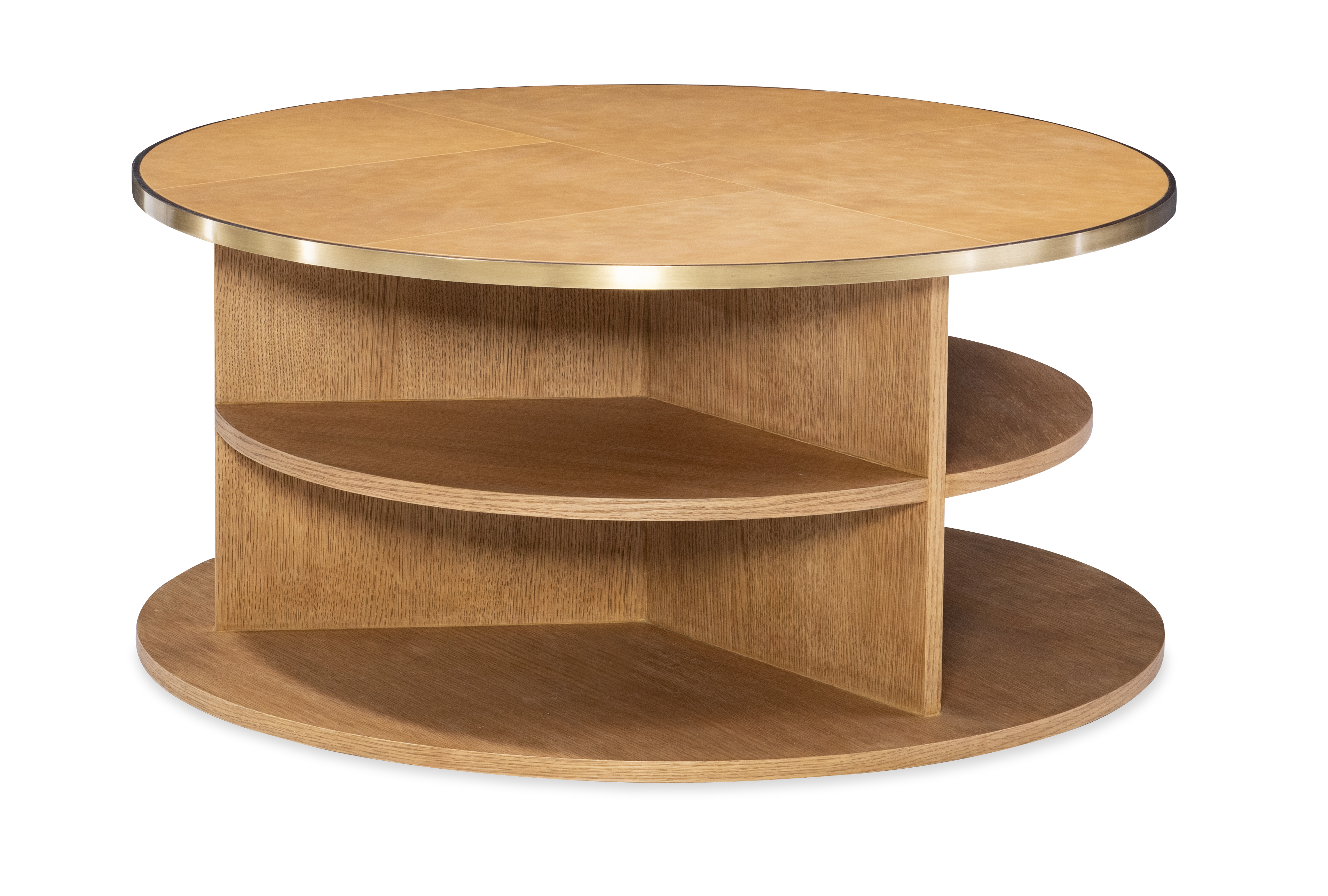 Refined yet contemporary, this round coffee table showcases a warm caramel leather-wrapped top framed in brass and balanced over an oak base. The circular silhouette emphasizes harmony and proportion, while the lower shelf adds functional display space. A statement of modern craftsmanship with classic undertones.