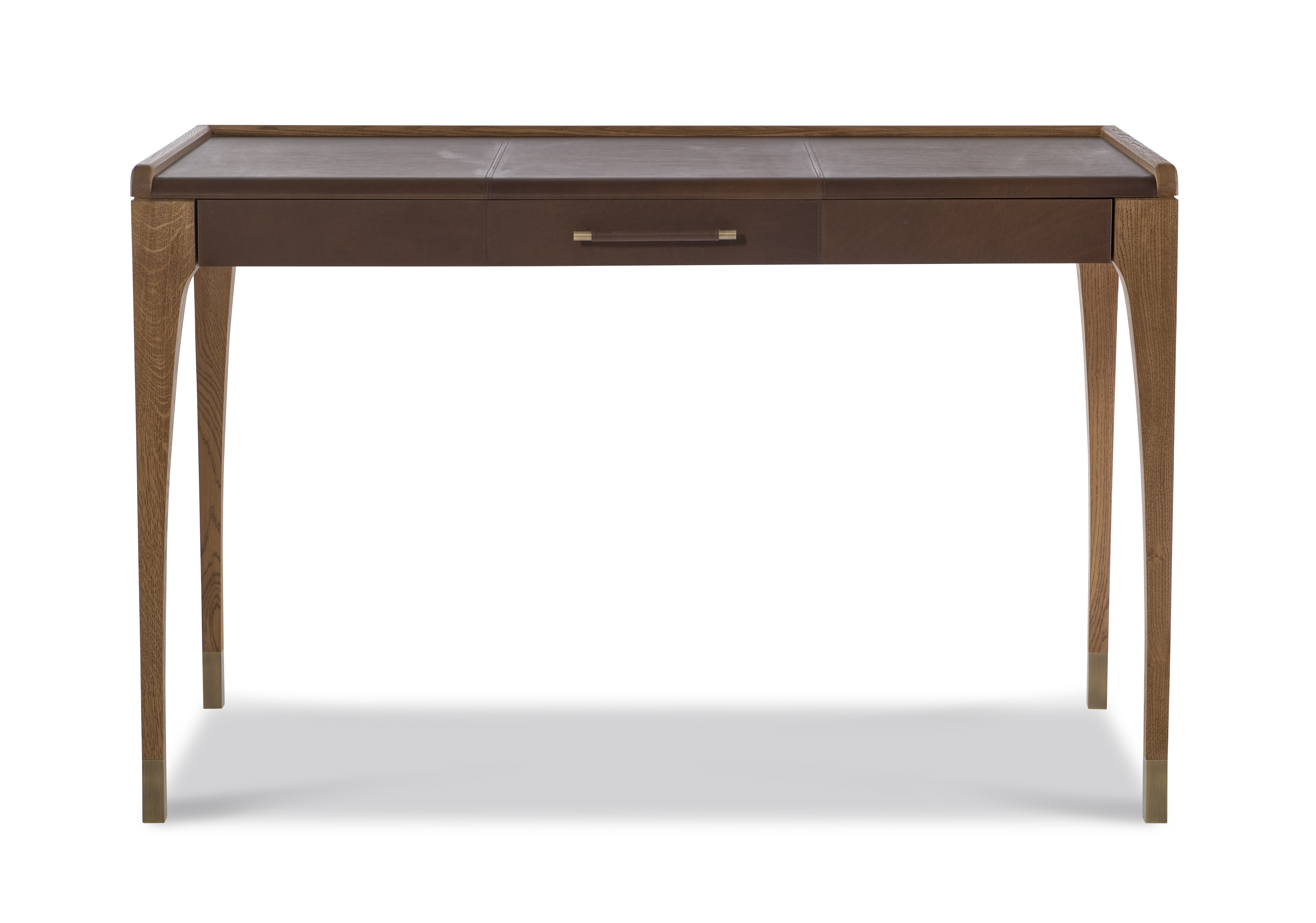 This leather-inset writing desk combines classic craftsmanship with a modern silhouette. The warm oak frame is paired with a supple leather top, offering both tactile richness and visual balance. Subtle brass accents on the drawer pull and leg caps lend a touch of sophistication, creating a versatile piece suited for refined home offices or boutique interiors.