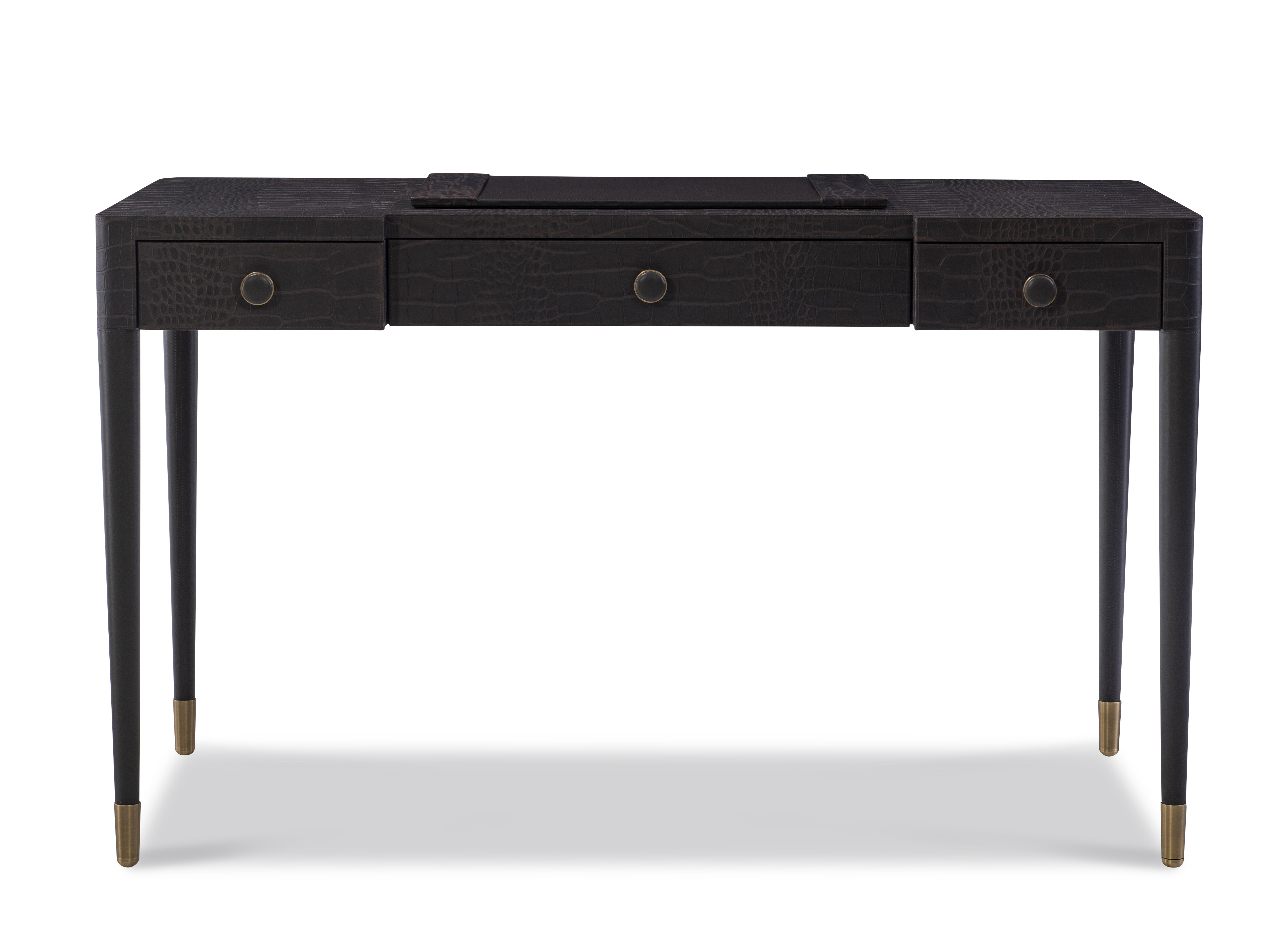 Tailored and tactile, this desk combines sleek form with luxurious texture. Wrapped in embossed leather with a crocodile motif, it rests on slender, tapered legs accented by polished brass caps and sculpted hardware.