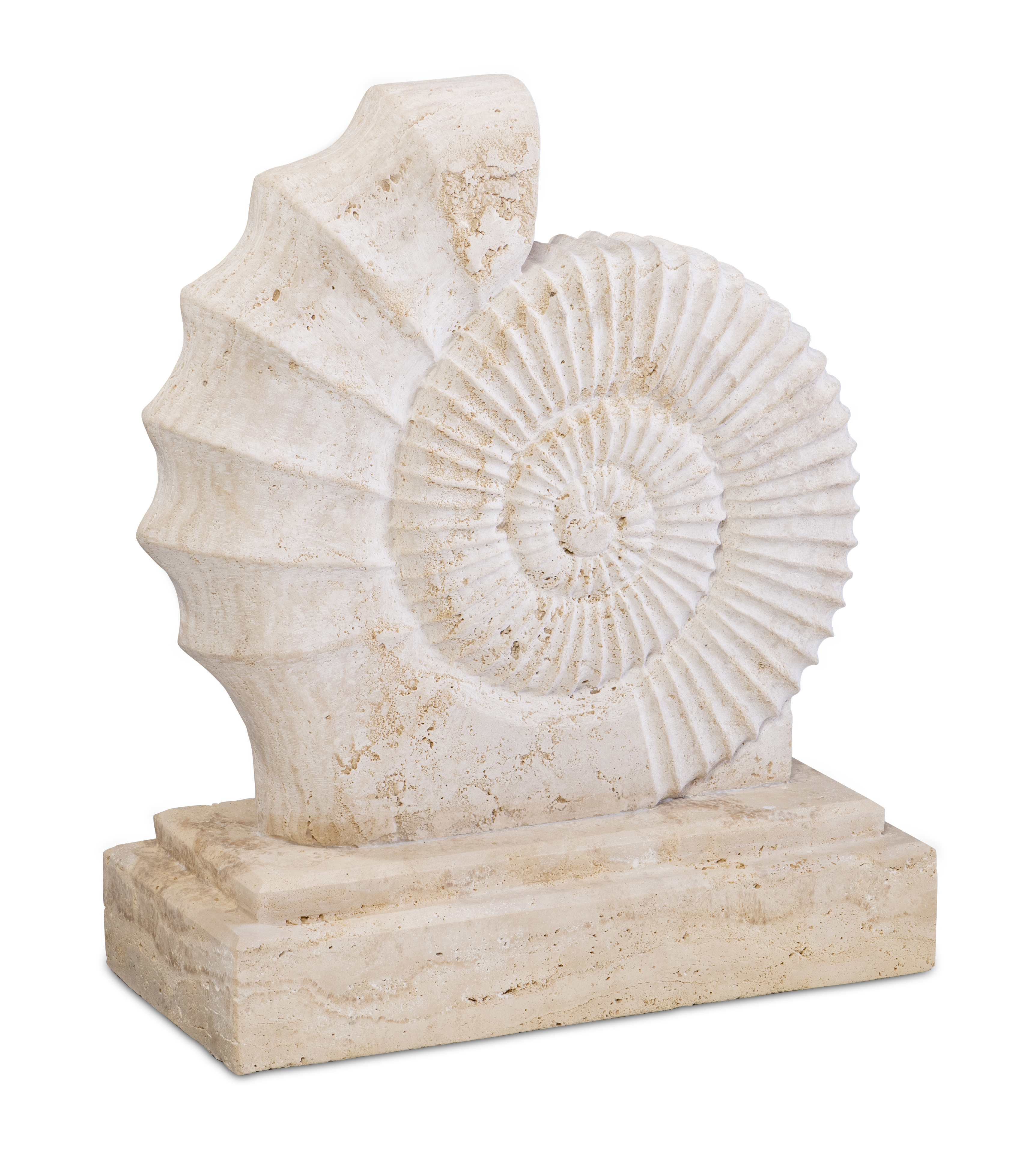 Inspired by the mythic sea nymphs of ancient Greek lore, the Nereid Sculpture captures the quiet poetry of forms shaped by the sea. Carved from warm travertine, the spiraling shell-like motif evokes fossils and ocean relics long preserved in stone, its rhythmic ridges unfolding in graceful symmetry. Resting upon a solid base, the sculpture feels like a fragment of the ancient shoreline—an object that might have been gathered during a Grand Tour along the Mediterranean coast. Both organic and architectural in presence, the piece reflects Maitland-Smith’s enduring appreciation for classical inspiration, storied materials, and the romance of collected treasures.