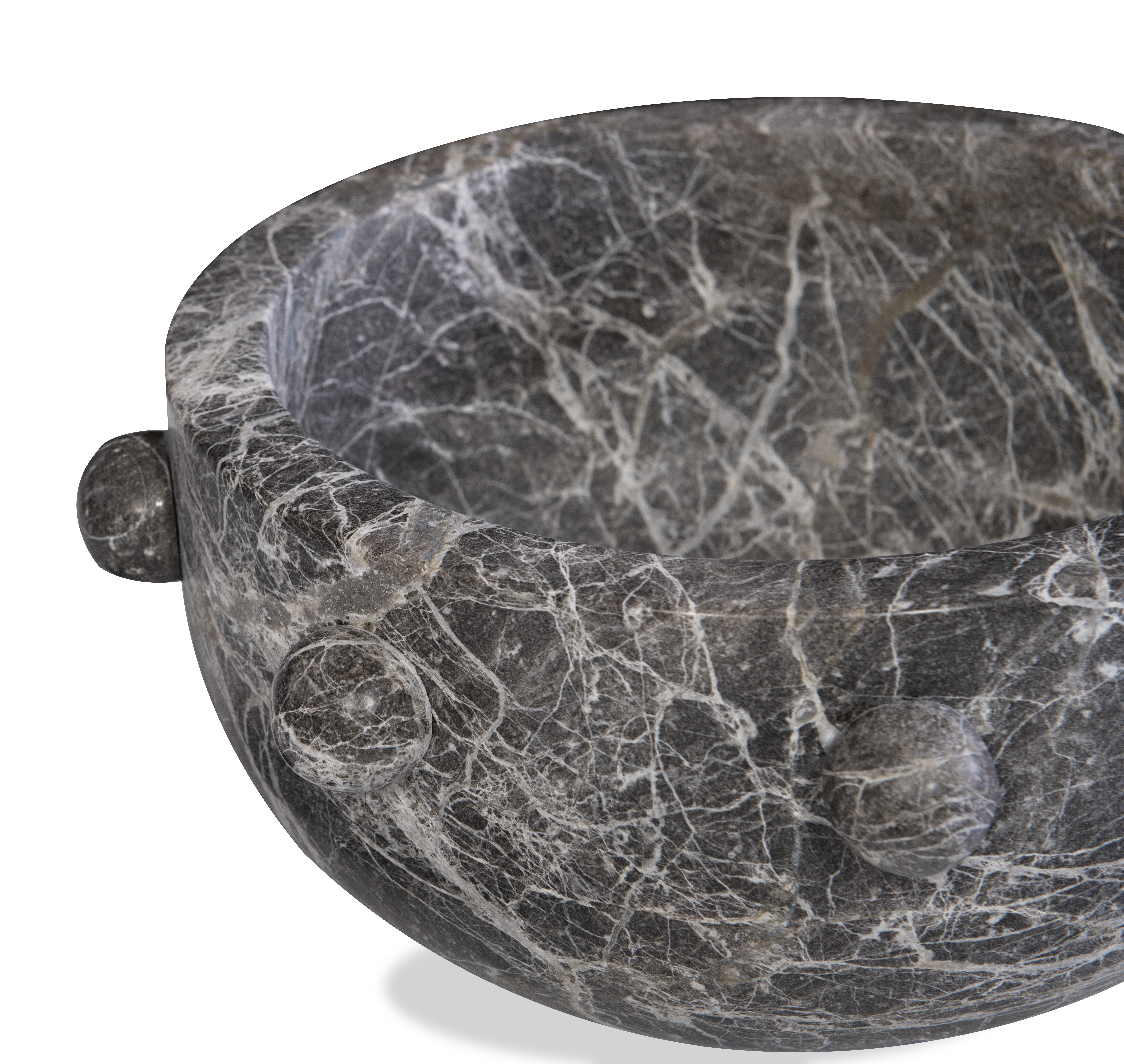 Echoing the artifact-like beauty of ancient vessels, this rounded stone bowl is adorned with polished brass studs that catch the light like scattered relics. The juxtaposition of its hand-textured surface and refined metallic accents evokes a sense of timeless craftsmanship — a modern ode to the ceremonial forms of antiquity. Both decorative and functional, it serves as a striking centerpiece or sculptural catchall.