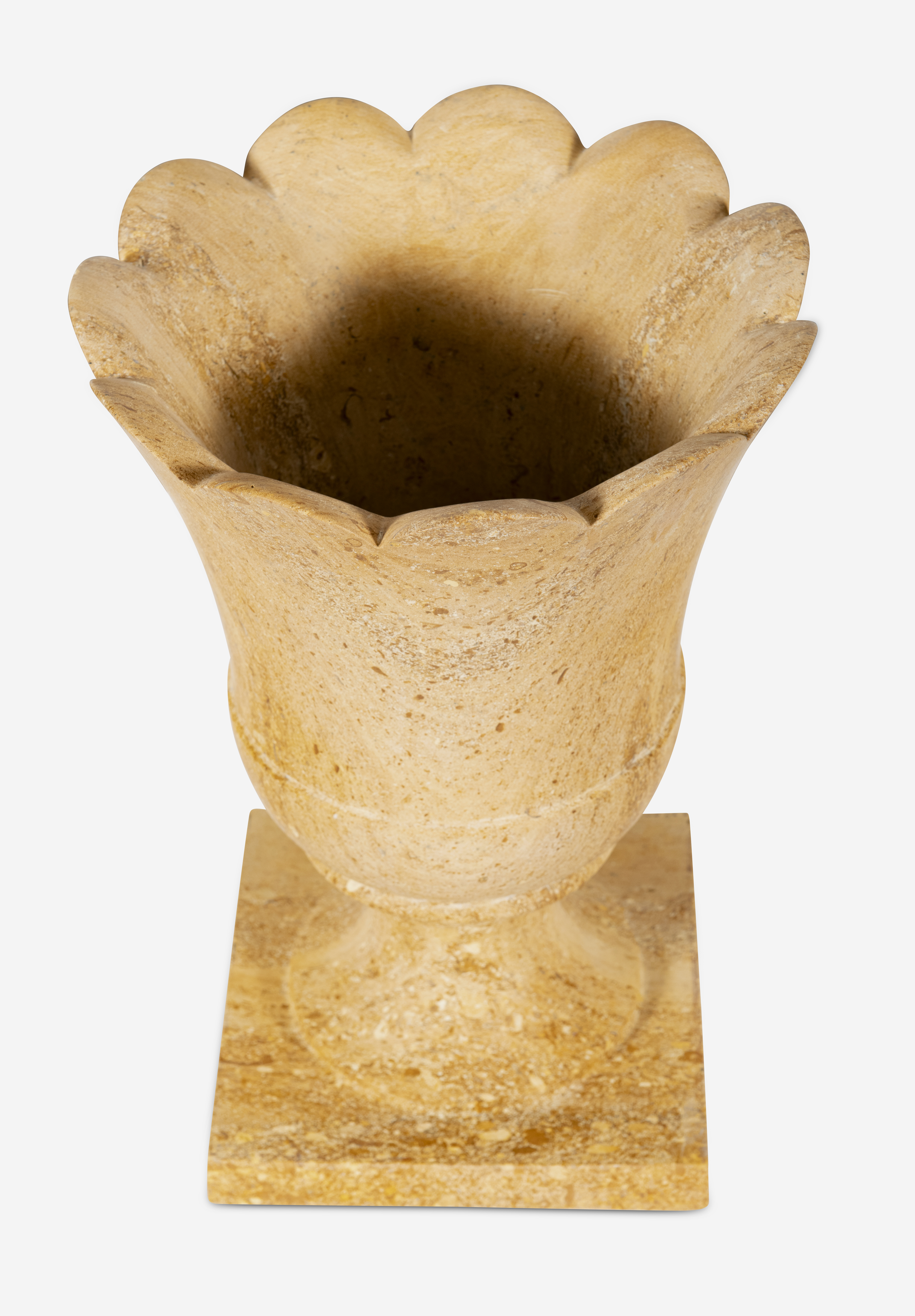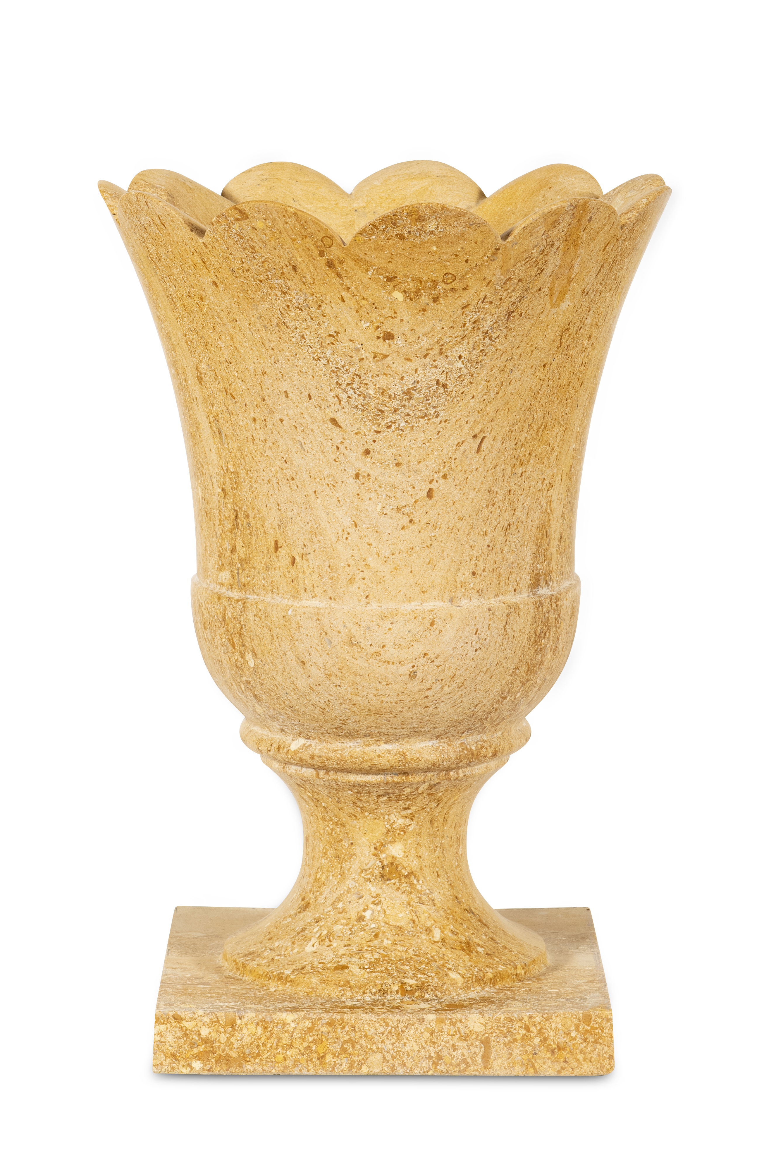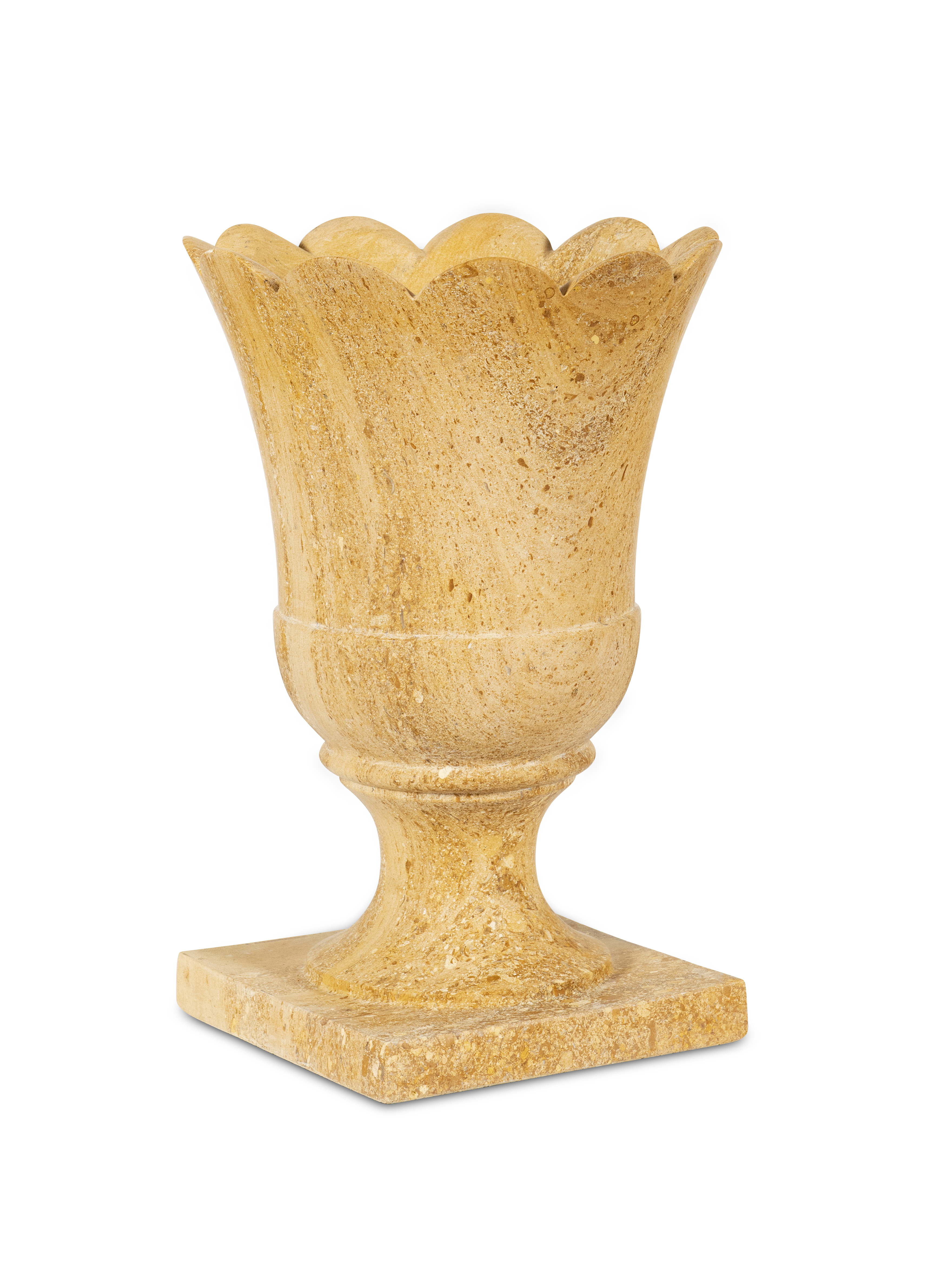 Elegant and timeless, the vase reimagines the romance of classical gardens. Its scalloped rim and graceful pedestal silhouette recall the carved stone vessels that adorned ancient terraces and courtyards. The warm, golden stone from Rajasthan, India enhances its sculptural presence, blending classical ornament with understated luxury—a perfect accent for an entryway, conservatory, or formal garden.