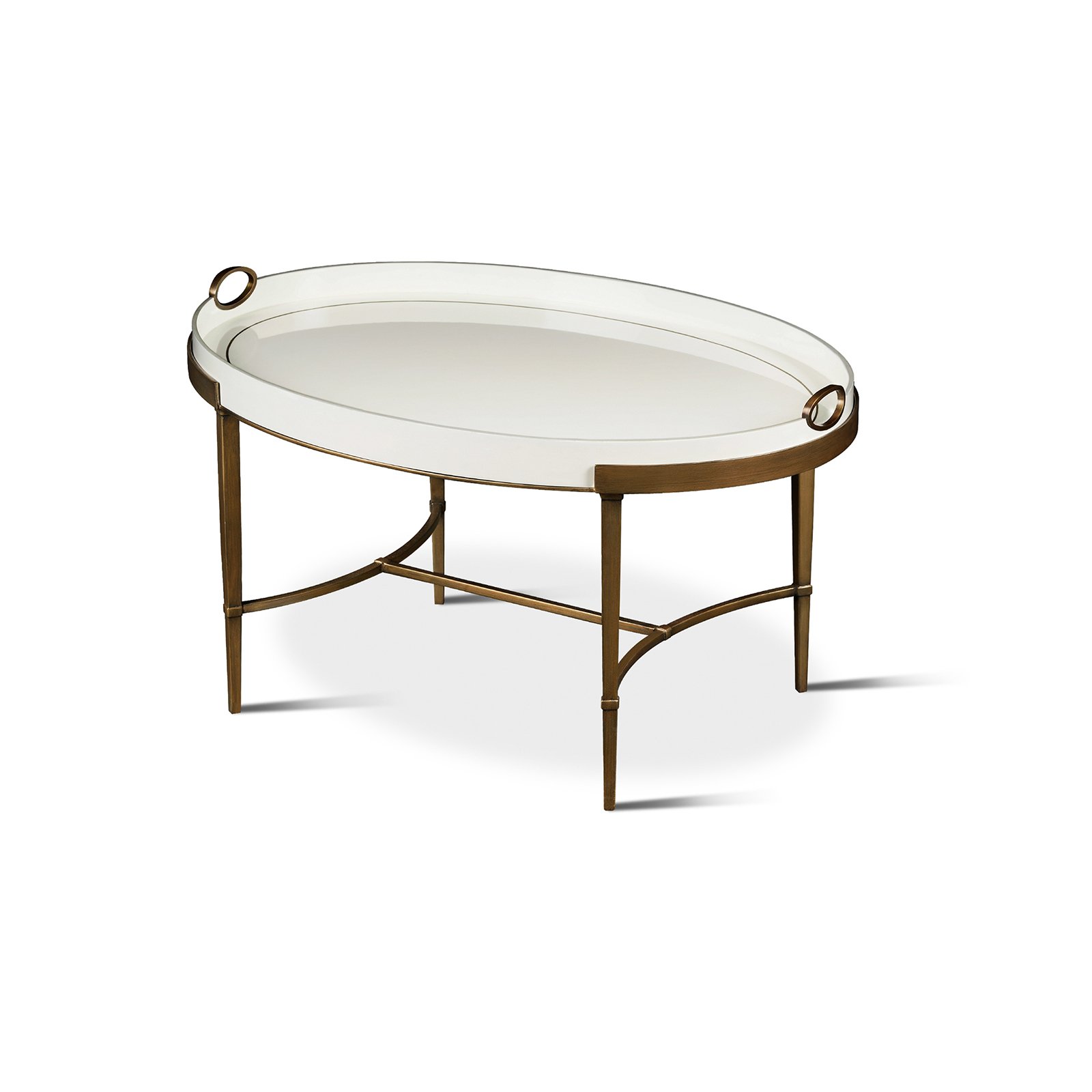 Lightly Antiqued Gold Iron and Cremona oval cocktail table with Brass handles.