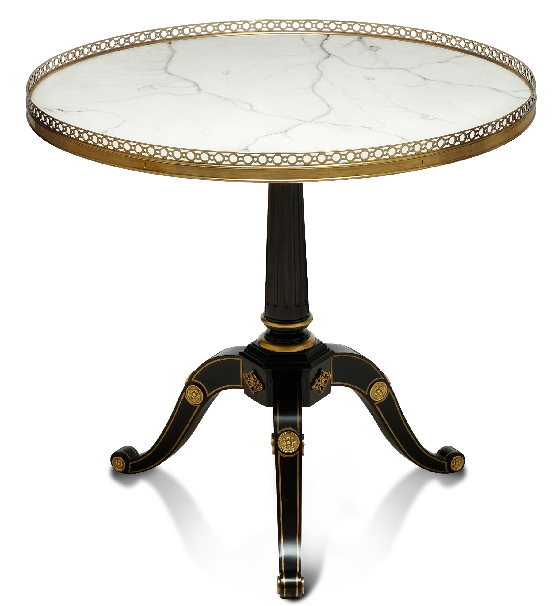Ebonized tripod round lamp table with Faux Ivory Marble top and Brass accents.