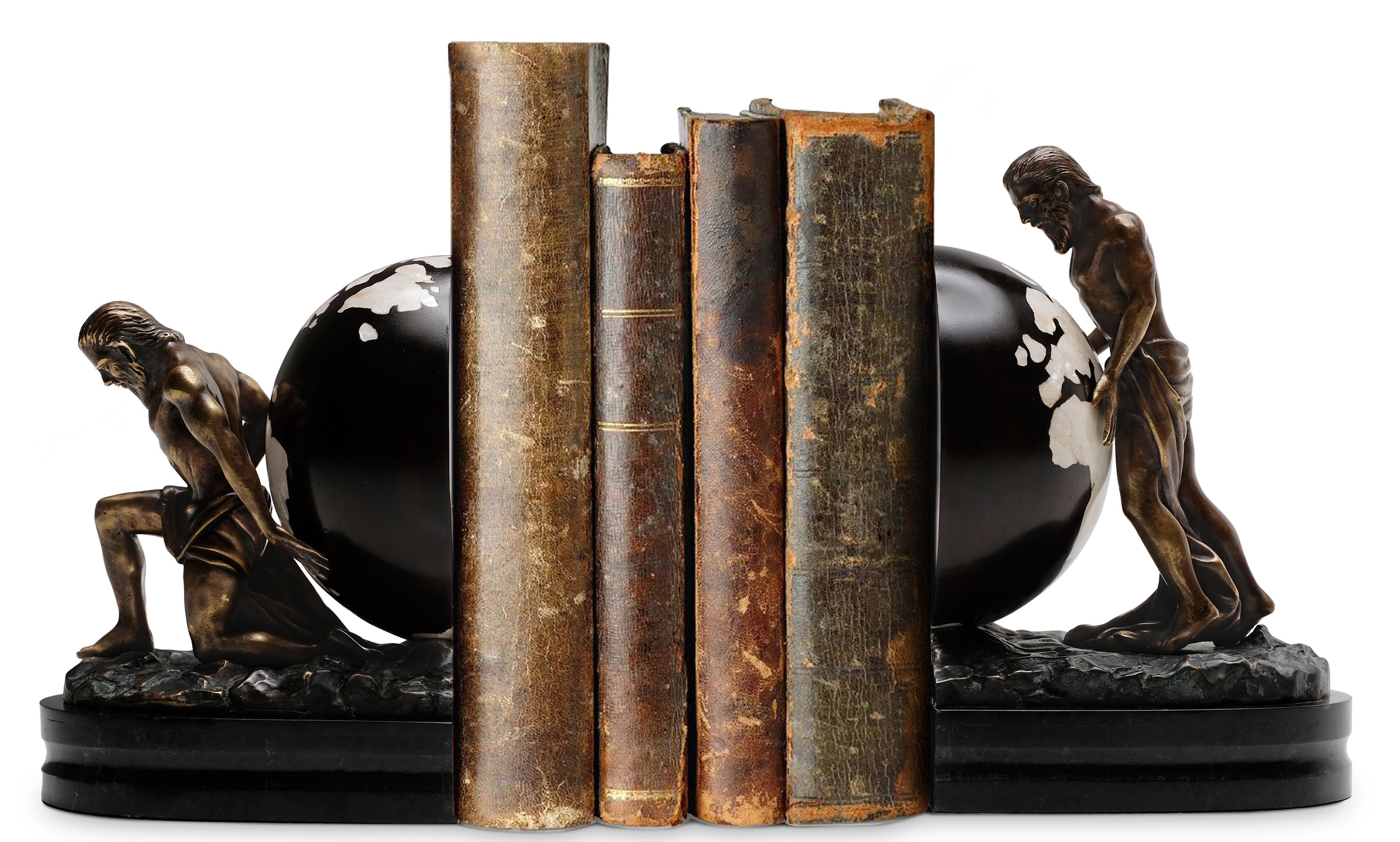 A pair of Brass atlases and Mother of Pearl inlaid Mahogany globe bookends on Black Stone inlaid bases.